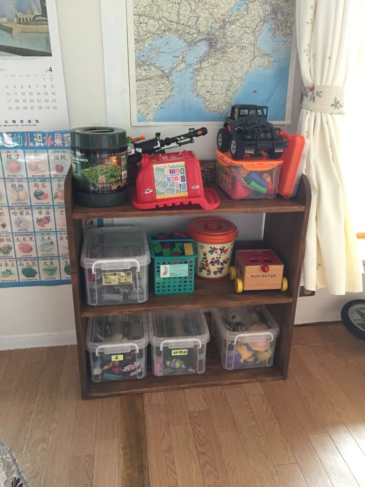 书架做好后,孩子妈就往上摆小朋友看的书。摆着摆着儿子提出异议,他要把自己的玩具放上面,理由是现在玩具放得太乱需要柜子。理由太充分,孩子妈马上就接受了。上图都是儿子自己摆的。