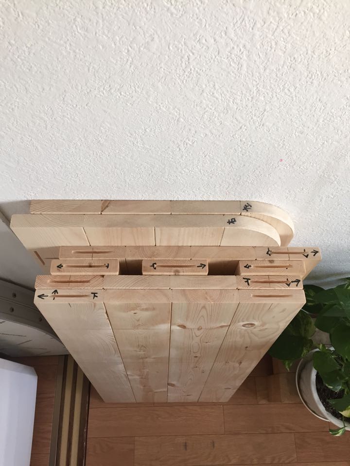 每4根连接在一起作为一个平面,书架纵深也就是89mm*4=356毫米。用饼干隼+乳白胶接板,之后切割成立板两块横板3块,另外背板3条。