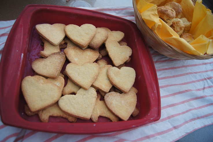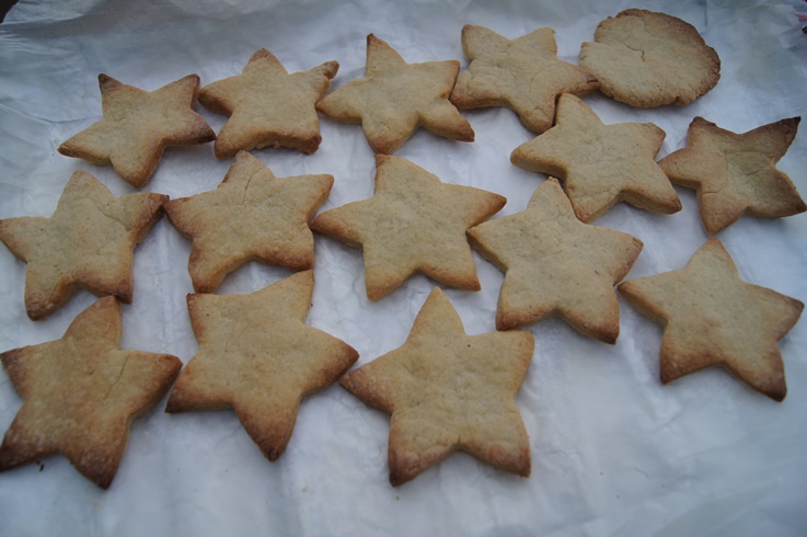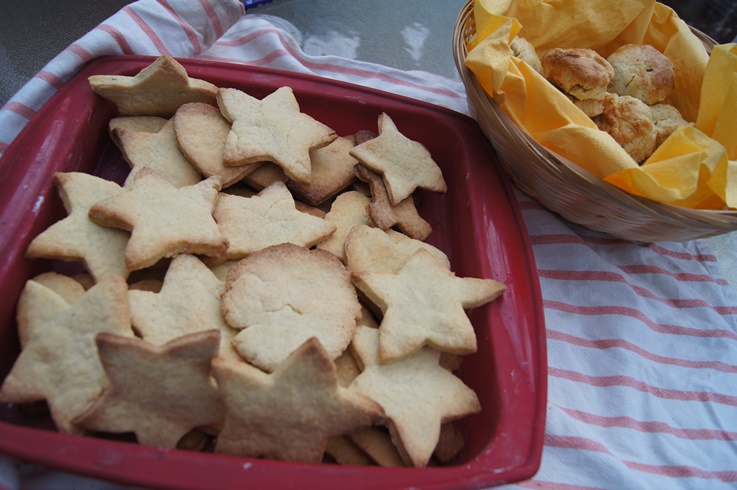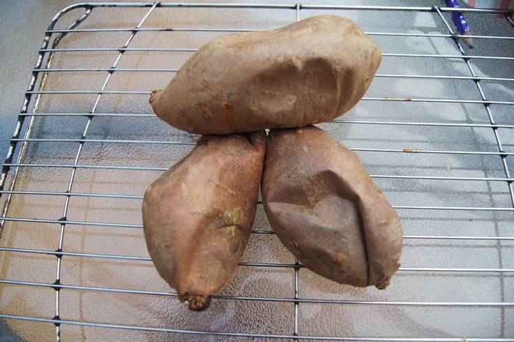 放上音乐,打开烤箱预热,拿面粉,苏打粉,找秤,打鸡蛋,瞬间,厨房里一片大乱。将面粉,鸡蛋,黄油,苏打粉,盐,糖,奶等放入盆里下手搅和后放在案板上,擀平,再用biscuit cutter 切成不同形状,放入烤盘里,然后请入烤箱,定 时。一边打扫战场,一边等着。将一切瓶瓶罐罐瞬间消失。清洗完毕,厨房又恢复了干净整洁。这时,屋里充满了浓浓的香味儿。15分钟后,成品出炉。对了,还顺便烤了白薯,北京人叫白薯,东北人称之地瓜。白薯要烤一个小时,先放进去。其他的其实是搭车。烤白薯勾起了我的乡愁,想起了北京冬天街头的大油桶烤白薯。寒冷的冬天在路上买上一块,又解饱,又暖手,还冒着热气儿呢。现在不知道还有没有,可能早就取缔了。