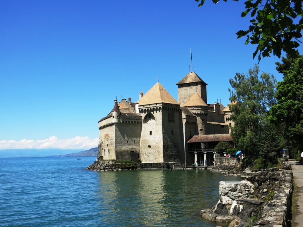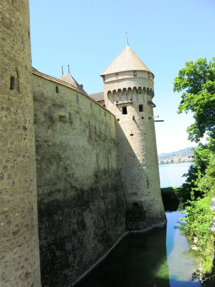 上午在洛桑进行短暂逗留之后,多儿和皮儿乘11:40的古董蒸汽船前往蒙特勒(MONTREAUX)。1:25,船行左侧,即见一宏伟古堡。船上的广播播报为西庸古堡(英文名:Chillon Castle 法文名:Château de Chillon)。多儿一听,立即来了兴头,对皮儿说:我们下船喽!就在这。不去别的地儿了。