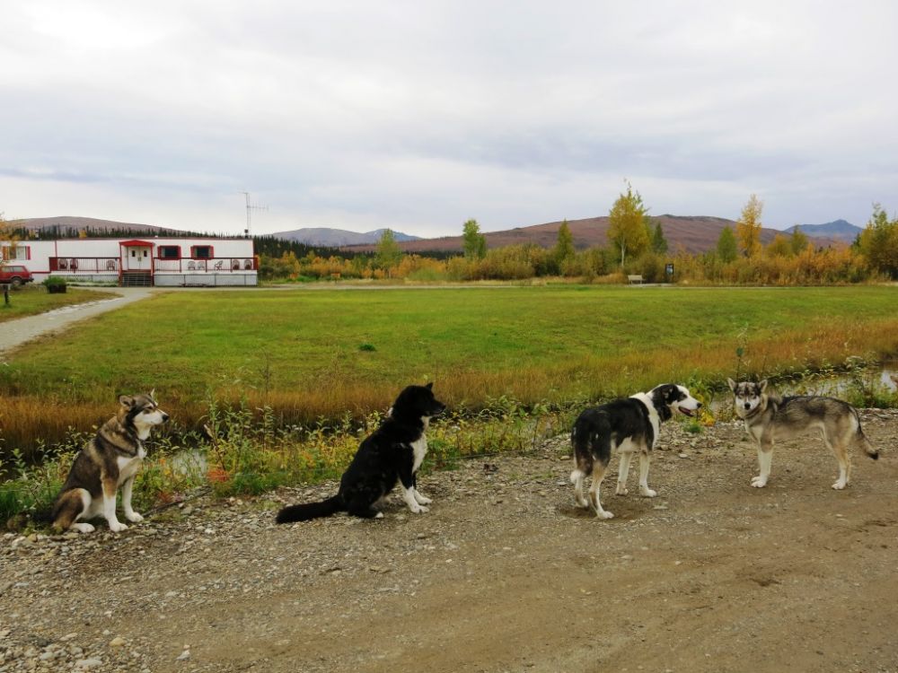 回程就简单多了。驾车经验足了。路上的坑洞小意思了。路边的风景也可以在有准备的前提下事先估摸着下车欣赏一阵了。而且到了冻脚丫(coldfoot)又加了点油。虽说总感觉量上没有达到希望值,但价格的昂贵也早已有心理准备。毕竟只有这么一家油站,不加是无论如何到不了目的地的。趁加油的闲工夫,鱼儿和舟儿还跟几只雪橇狗玩了会。也算旅途中很好的放松了。