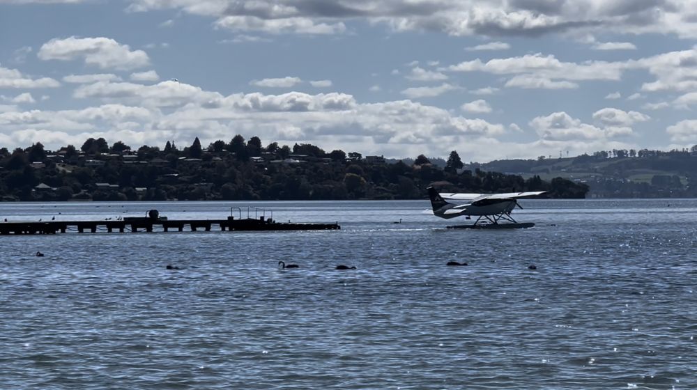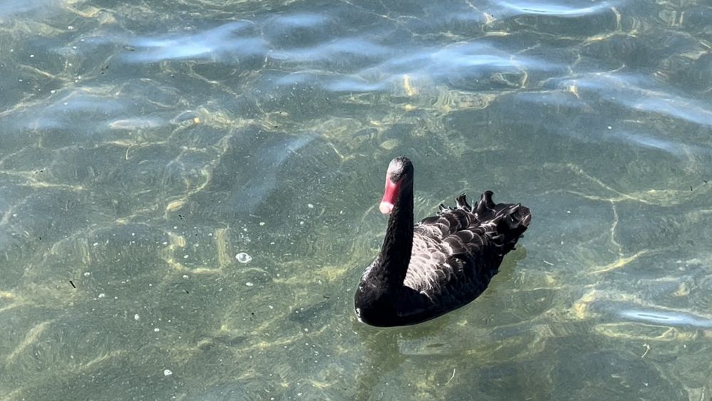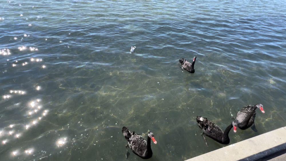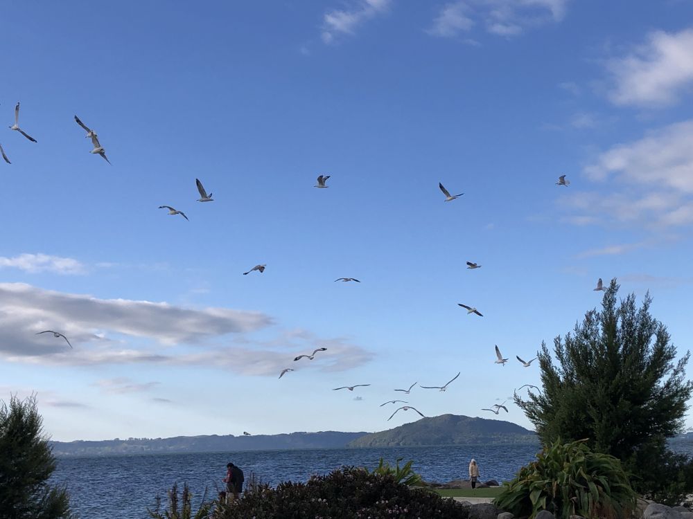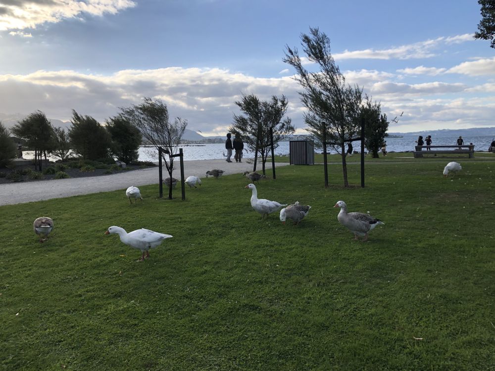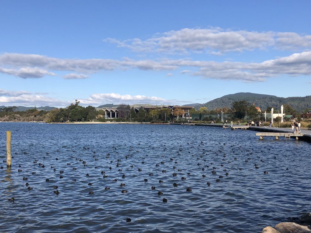 再往前走,他们听到了湖水轻轻拍打岸边的声音。罗托鲁瓦湖出现在视野中,平静的湖面在阳光下闪烁着粼粼波光,仿佛镶嵌着无数细小的宝石。而更引人注目的是湖面上优雅游动的黑天鹅。它们成群结队地滑行在水面上,黑色的羽毛与湖水形成鲜明对比,时不时低头啄水,悠然自得地享受着秋日的清晨。
