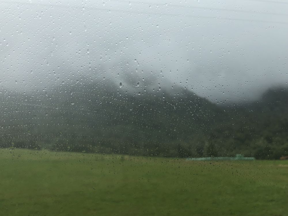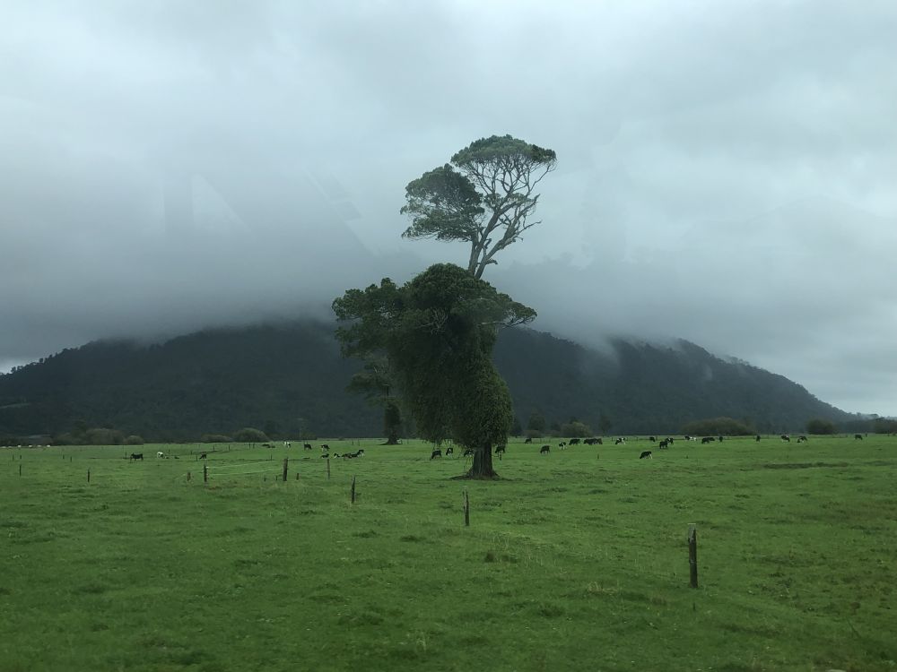 两人驾着车在小雨中穿行,本想趁着早晨雨势不大,尽快赶到著名的 Hokitika Gorge Walk。据说这条步道以牛奶蓝的河水和葱郁的森林闻名,是南岛西岸的一个标志性景点。然而,越接近目的地,雨势却逐渐变大,道路旁湿漉漉的田野和农场在雨幕中显得格外朦胧。