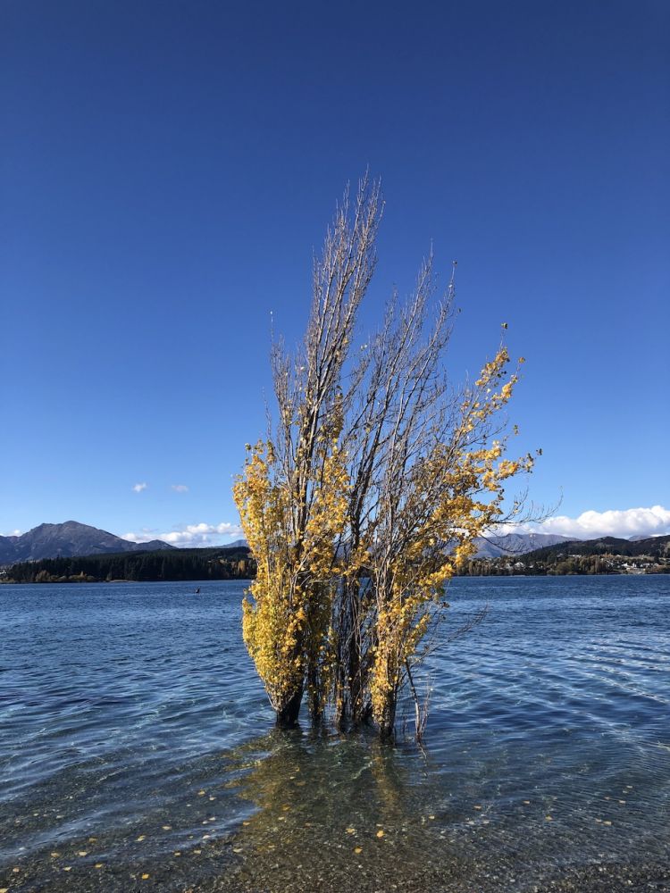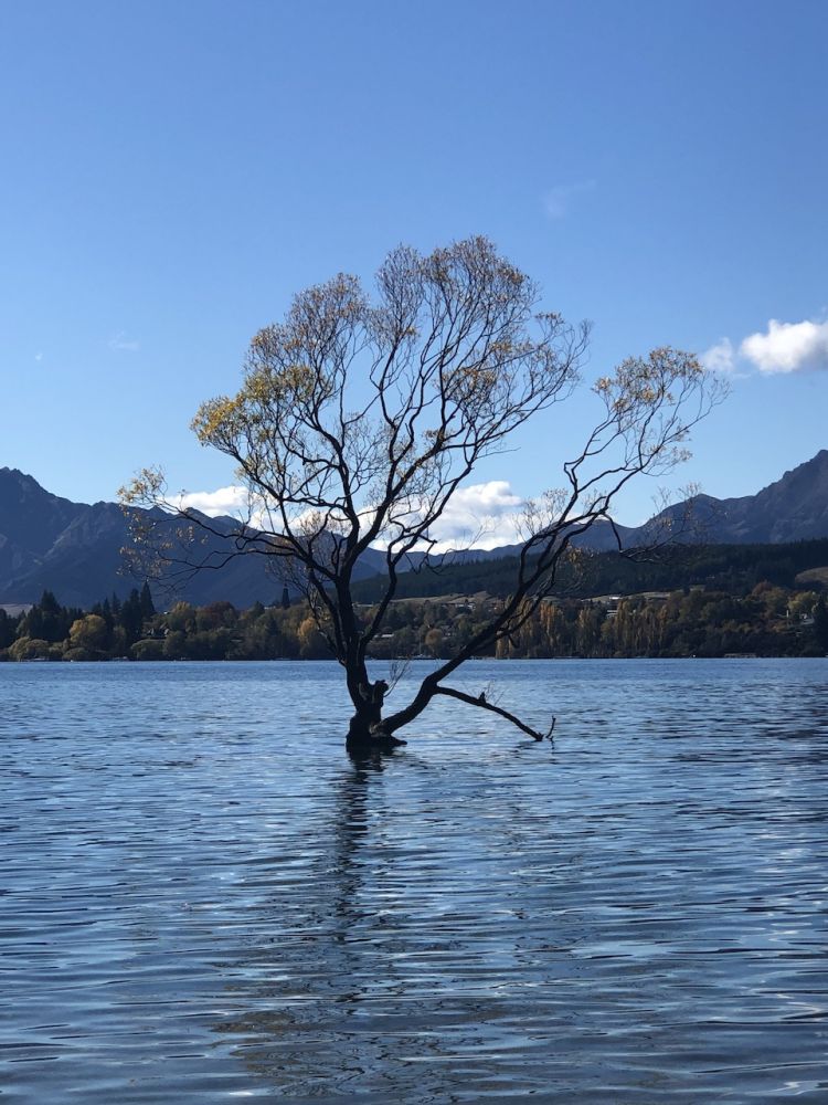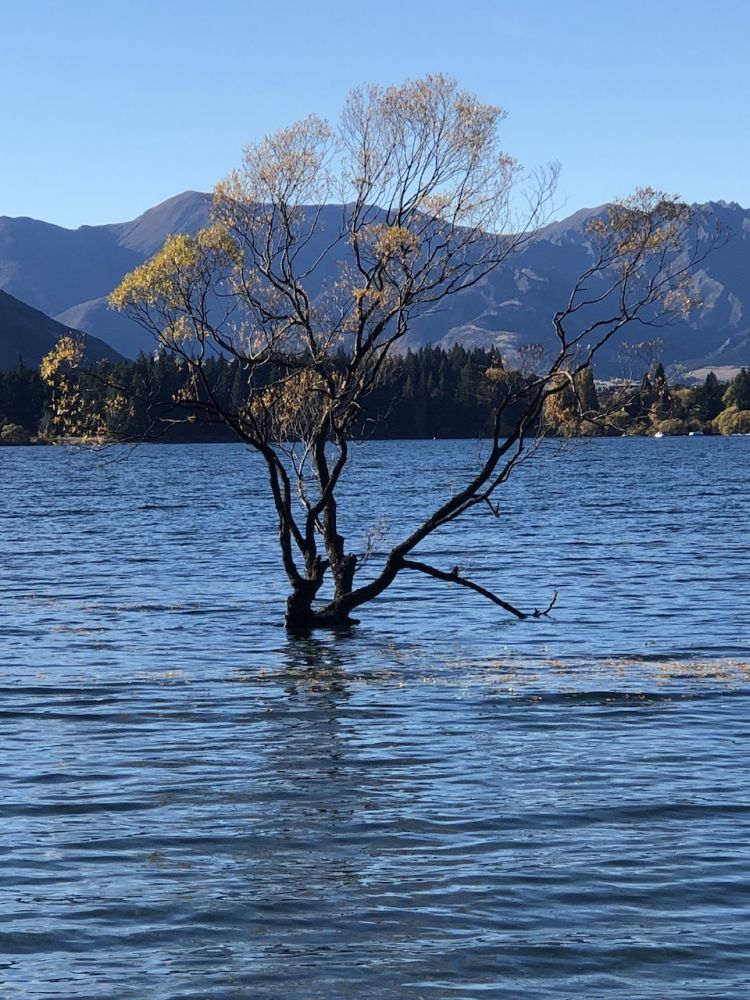 首先映入眼帘的一定是瓦纳卡湖的标志——那棵瓦纳卡树(That Wānaka Tree)。树所在的湖边围了很多人,或站或蹲或弯腰或曲背,都在选着角度与这棵树共享相机角度。这棵孤独地立于罗伊斯湾浅水中的柳树,也配得上这样的闪光灯伺候。它还真有百年的历史呢。它原本是一根简单的木桩,因柳树基因的关系,蓬勃发展到如今。虽经冰川水反复洗礼,仍屹立不倒。估计是它的坚韧和美丽,使它成为了瓦纳卡湖的象征。
