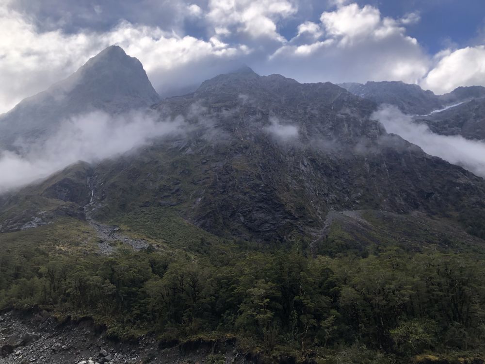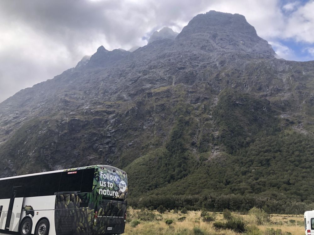 接近中午,阳光透过薄雾洒在米尔福德峡湾国家公园(Milford Sound National Park)的群山之间,远处山峰的轮廓宛若巨大的剪影。11点22分,多儿与皮儿将废水处理完毕,加足清水,便驾着露营房车驶离米尔福德峡湾,开始了另一场山水探秘。其实,就是顺路游览两处不大为大众熟知的自然奇景——猴溪(Monkey Creek)和瀑布溪瀑布(Falls Creek Waterfall)。