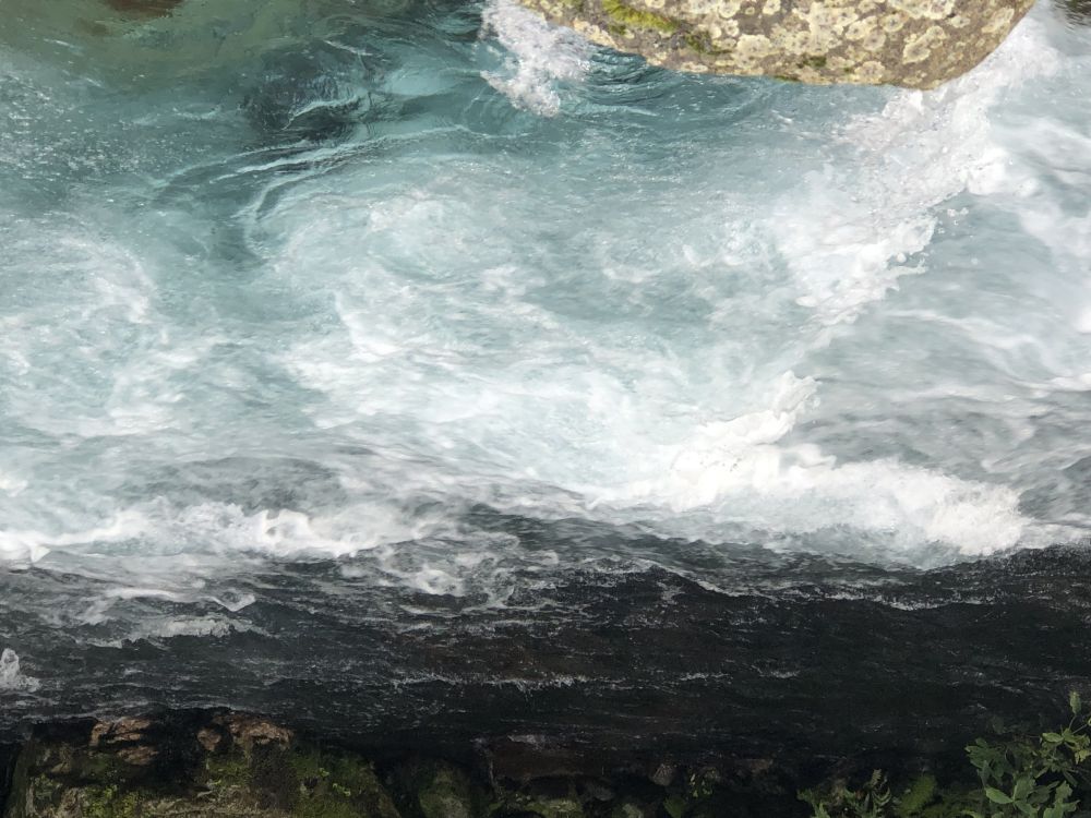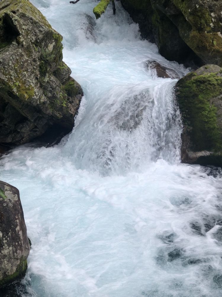 吊桥之后没多久,步行大约10分钟后,两人便来到一个木制观景平台,从这里能俯瞰壮观的玛丽安瀑布(Marian Falls)。瀑布泛着柔和的浅蓝色从山间倾泻而下,激起的水雾像一层薄薄的白纱笼罩在溪谷之间。多儿忍不住靠近观看,却差点滑了一跤。“树根和岩石都湿滑,小心点。”皮儿一边扶住她,一边指着前方,“看到那个标志牌了吗?我们得继续走。”