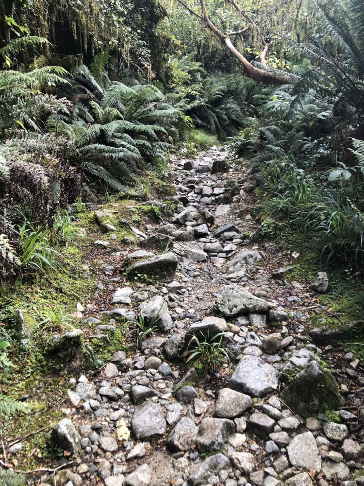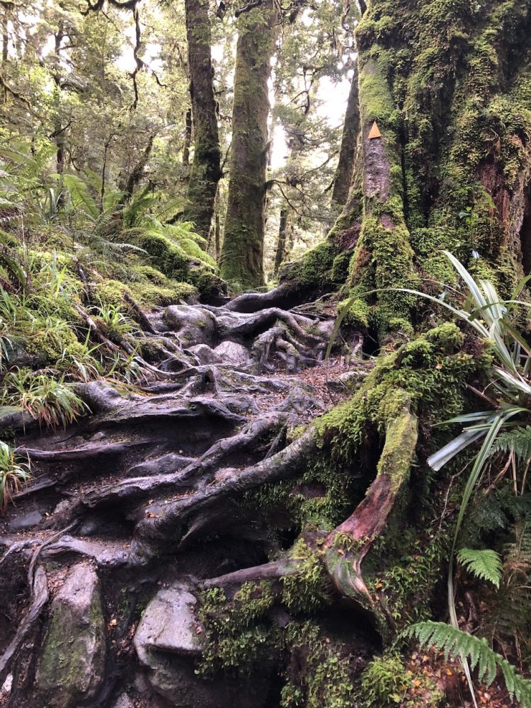 虽然提前知晓这个步道有许多树根横穿,还湿滑,多处路段也非常危险,皮儿和多儿互相提醒,注意脚下的树根,也都穿了良好抓地力和支撑性的登山靴。但还是觉得路途挺吃力的。有几次甚至问返程的人,是不是值得接着走啊?跟你们一道回去得了。每次都得到同样的回复:“就快到了。你们不会后悔的,加油!”。经过将近两个半小时攀爬,多儿和皮儿终于在3:26抵达了玛丽安湖。