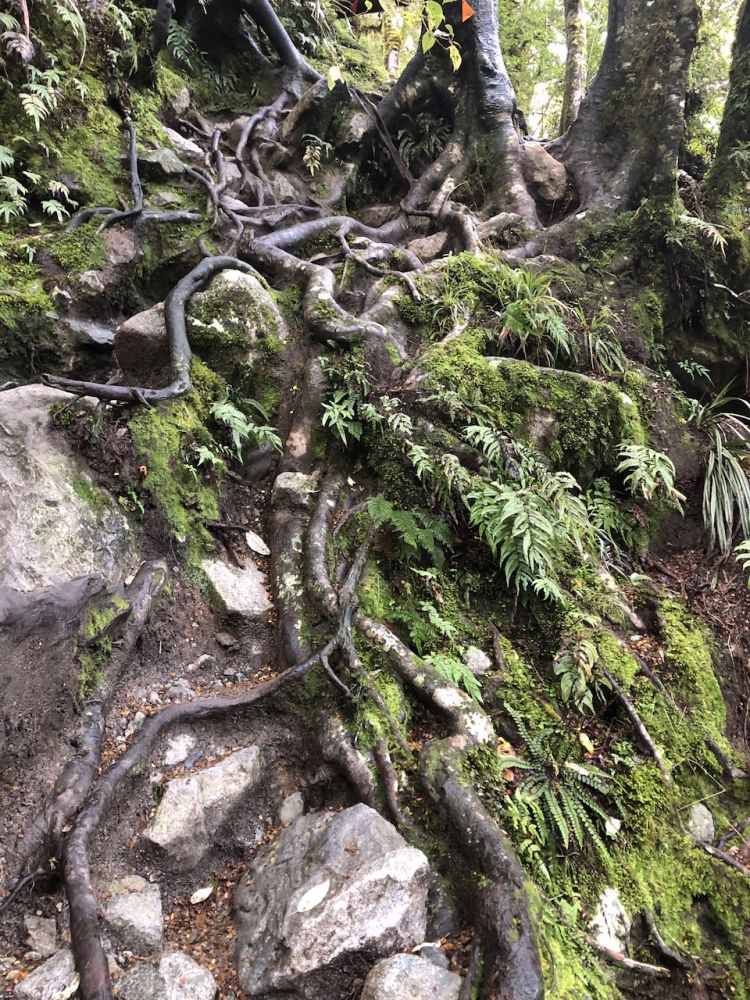 随着步道逐渐进入陡峭的森林区域,行走变得困难起来。树根纵横交错,偶尔还能看到一片泥泞的地面。大约1:40,两人本来随步道指引走得蛮好的,突然发现,自己在瀑布/河流边,怎么也找不到路标了。所谓的路标,就是订在树干上手掌那么大的橙色三角形塑料片。四个方向都摸索个几米,还是看不到路标。这时,俩人已经在林子中处于胡乱摸索的地步,偶尔停下来听听有没有人从附近穿过,以期跟随他们的声音找到出路。