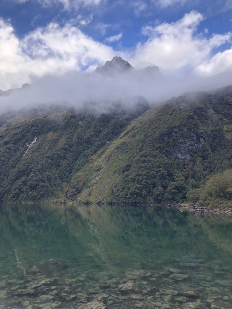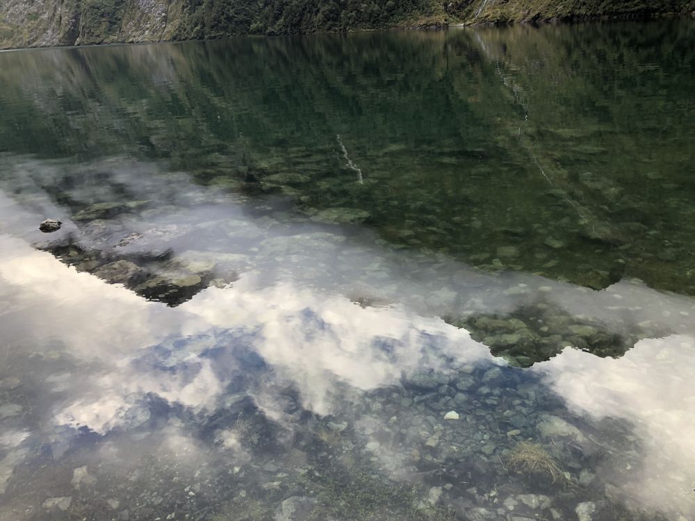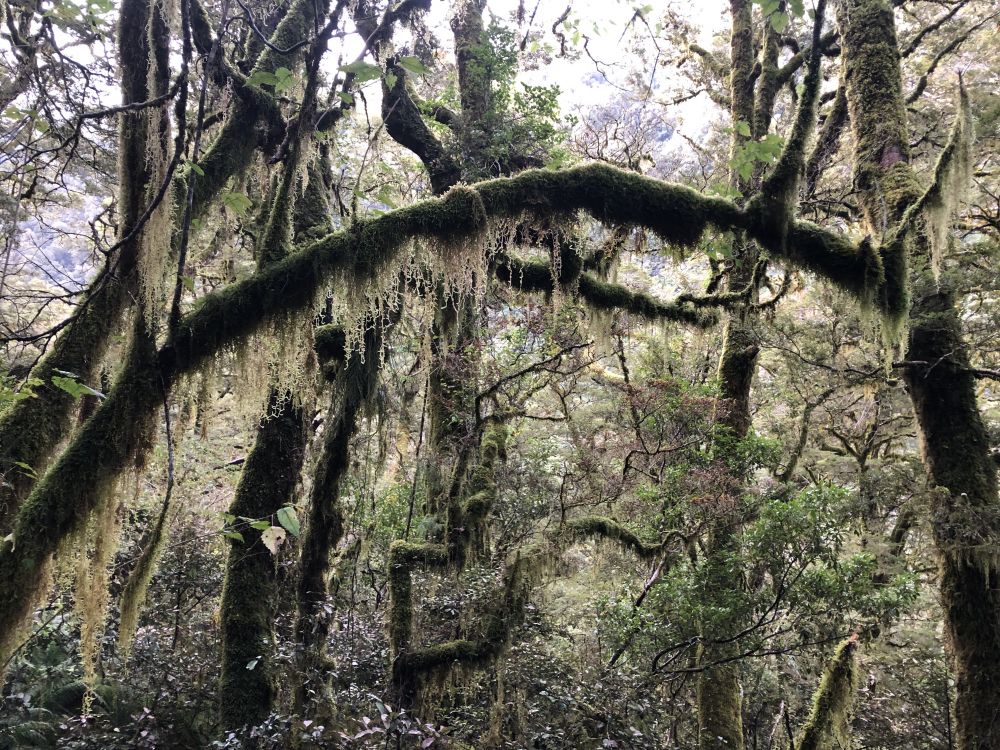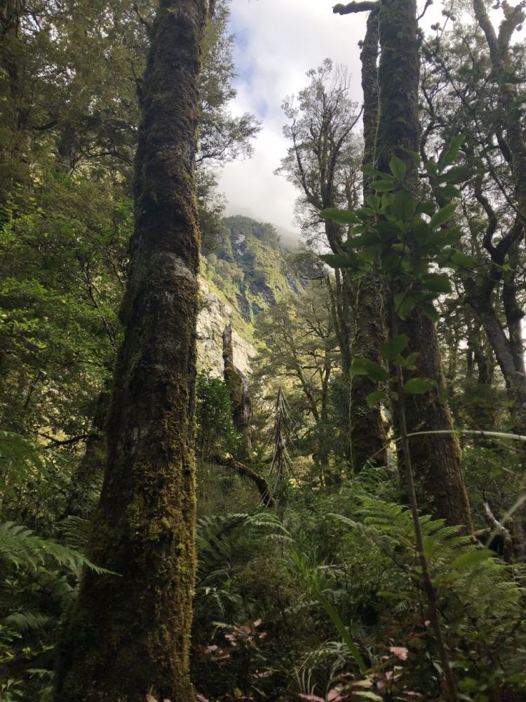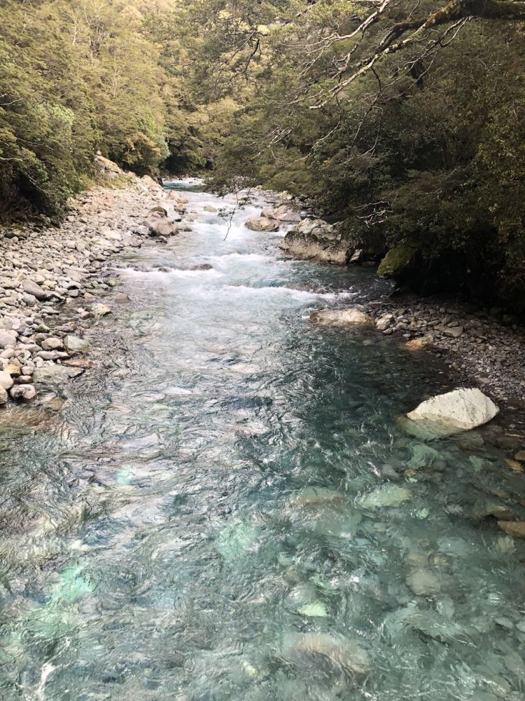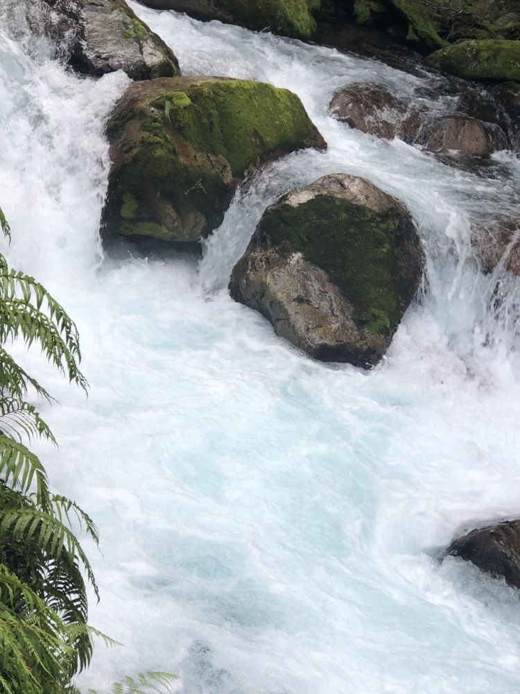 这条通往玛丽安湖的步道单程3.1公里,往返据说需要3至4小时。前往玛丽安湖(Lake Marian)的步道从穿越霍利福德河(Hollyford River)上的一座吊桥开始。多儿和皮儿美美地吃过午饭,简单整理下装备(手机,登山杖,水,小背包),正式踏上了前往玛丽安湖的徒步之旅。一开始的路段十分平缓,吊桥悬在霍利福德河上方,河水清澈见底,阳光在水面上折射出星星点点的光斑。这儿的景色,真像画一样。”多儿站在吊桥上,拍下几张照片。皮儿提醒她:“别太久了,咱们还有一段路要走呢。”