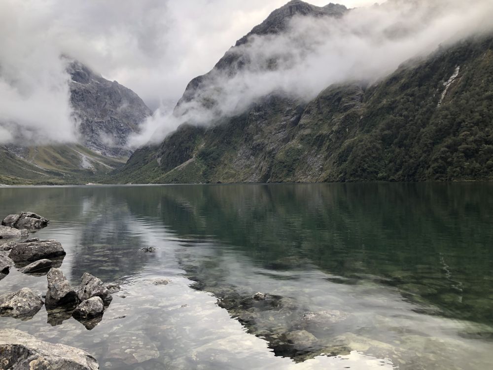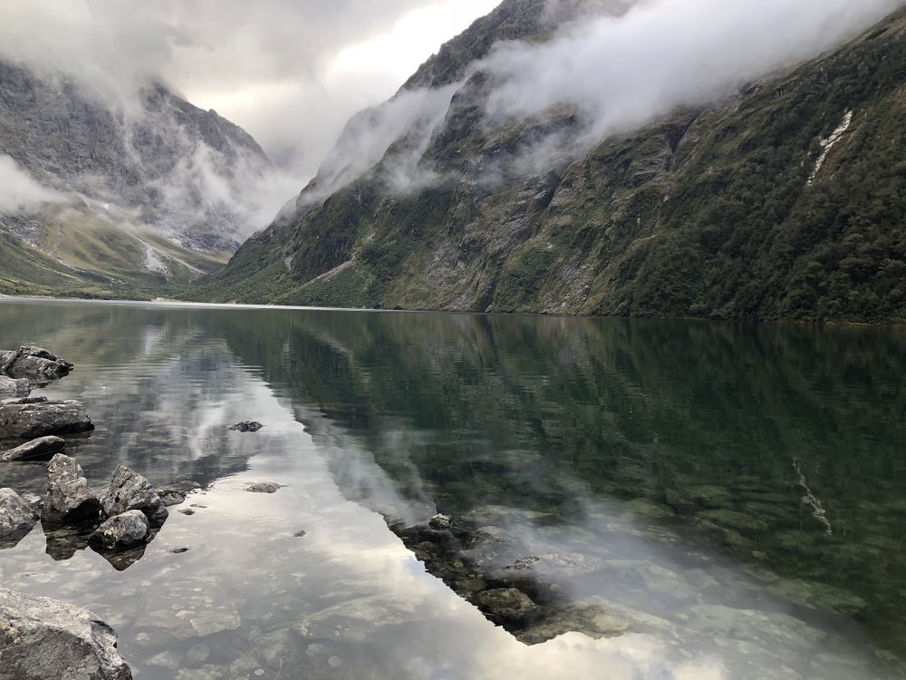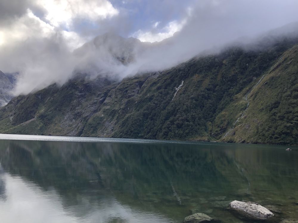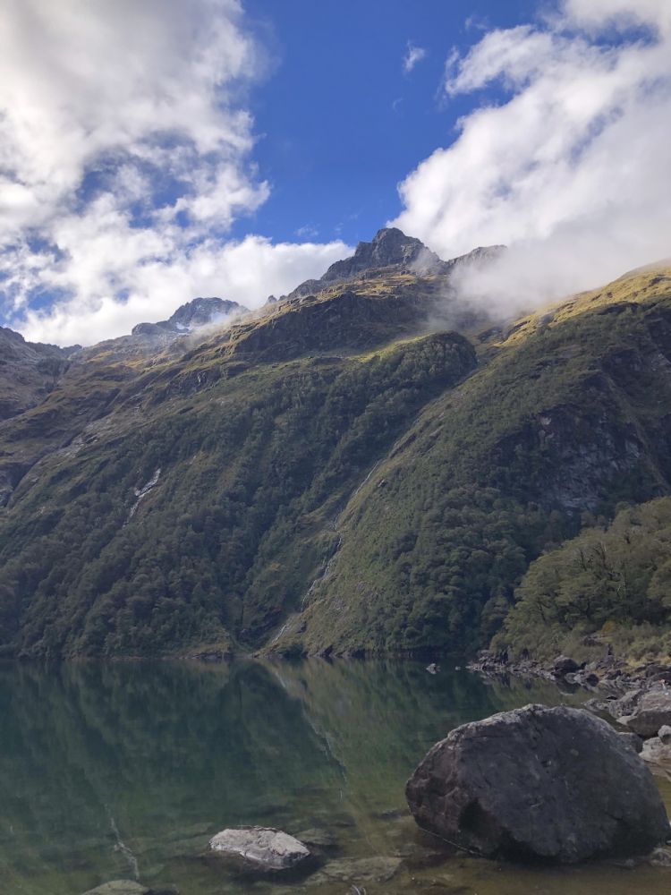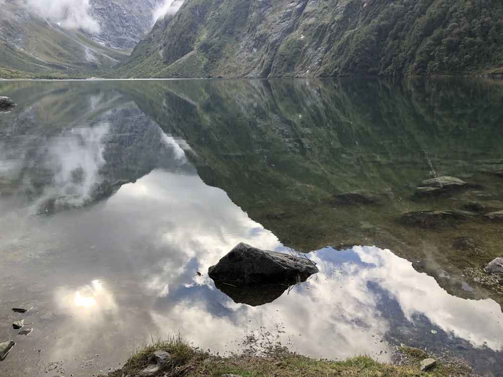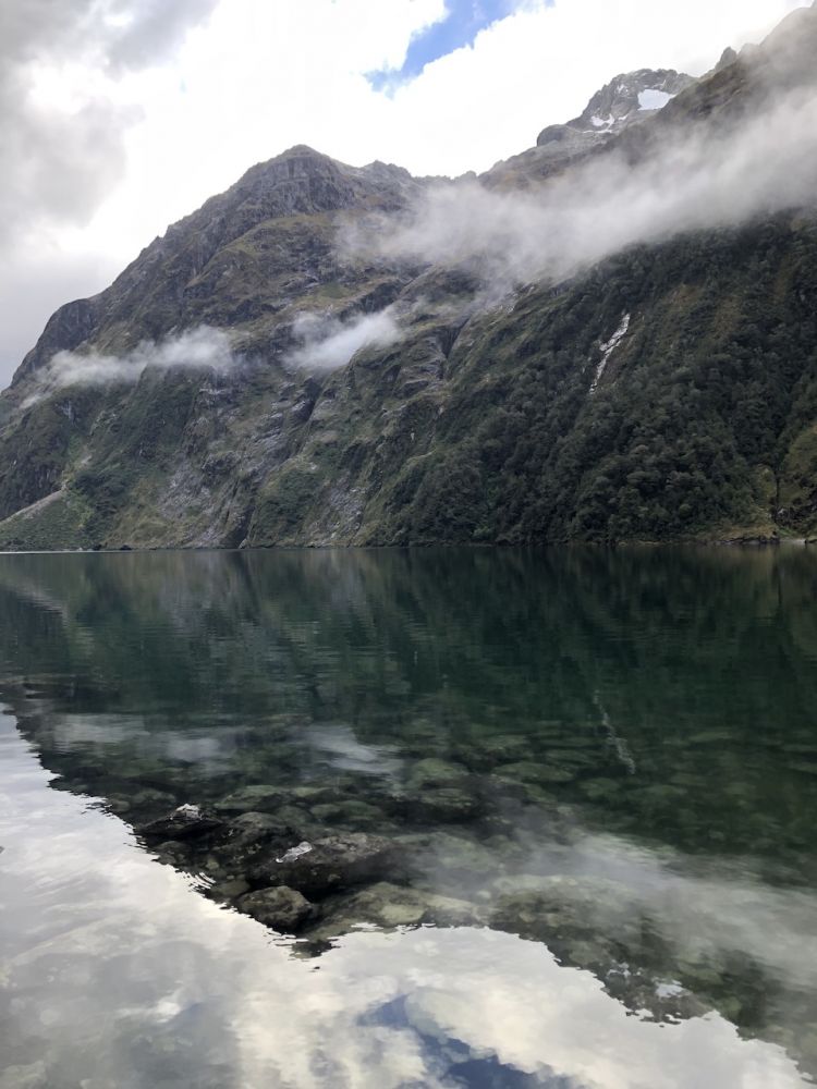 这条通往玛丽安湖的步道单程3.1公里,往返据说需要3至4小时。前往玛丽安湖(Lake Marian)的步道从穿越霍利福德河(Hollyford River)上的一座吊桥开始。多儿和皮儿美美地吃过午饭,简单整理下装备(手机,登山杖,水,小背包),正式踏上了前往玛丽安湖的徒步之旅。一开始的路段十分平缓,吊桥悬在霍利福德河上方,河水清澈见底,阳光在水面上折射出星星点点的光斑。这儿的景色,真像画一样。”多儿站在吊桥上,拍下几张照片。皮儿提醒她:“别太久了,咱们还有一段路要走呢。”