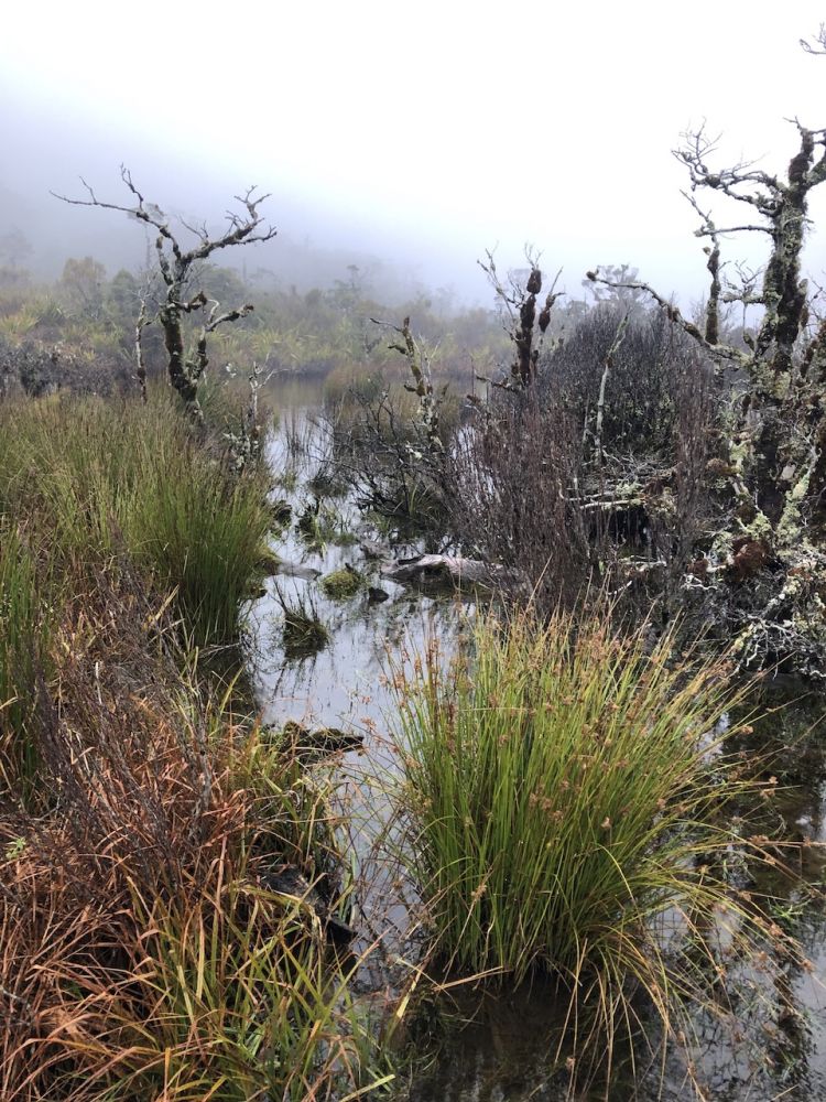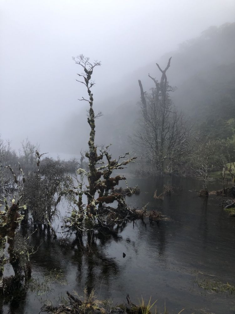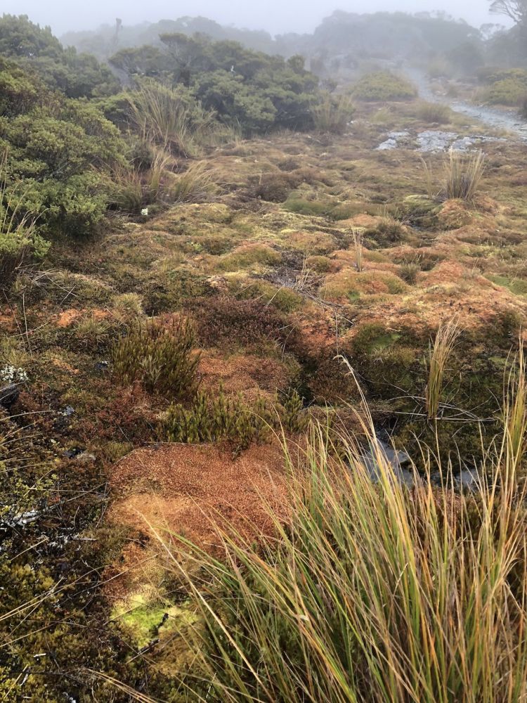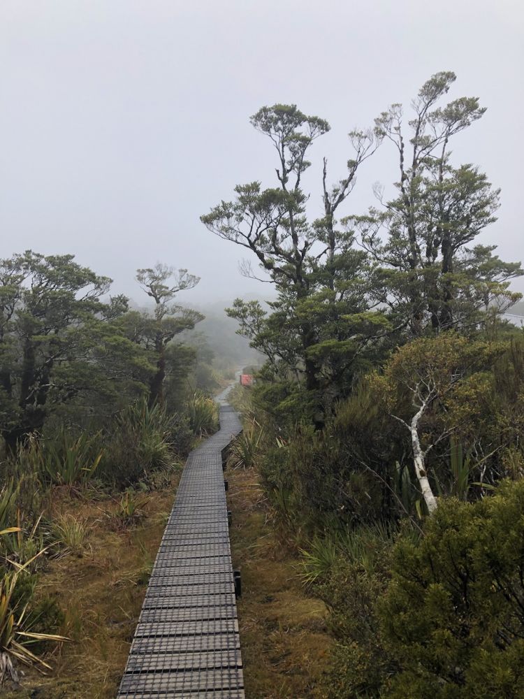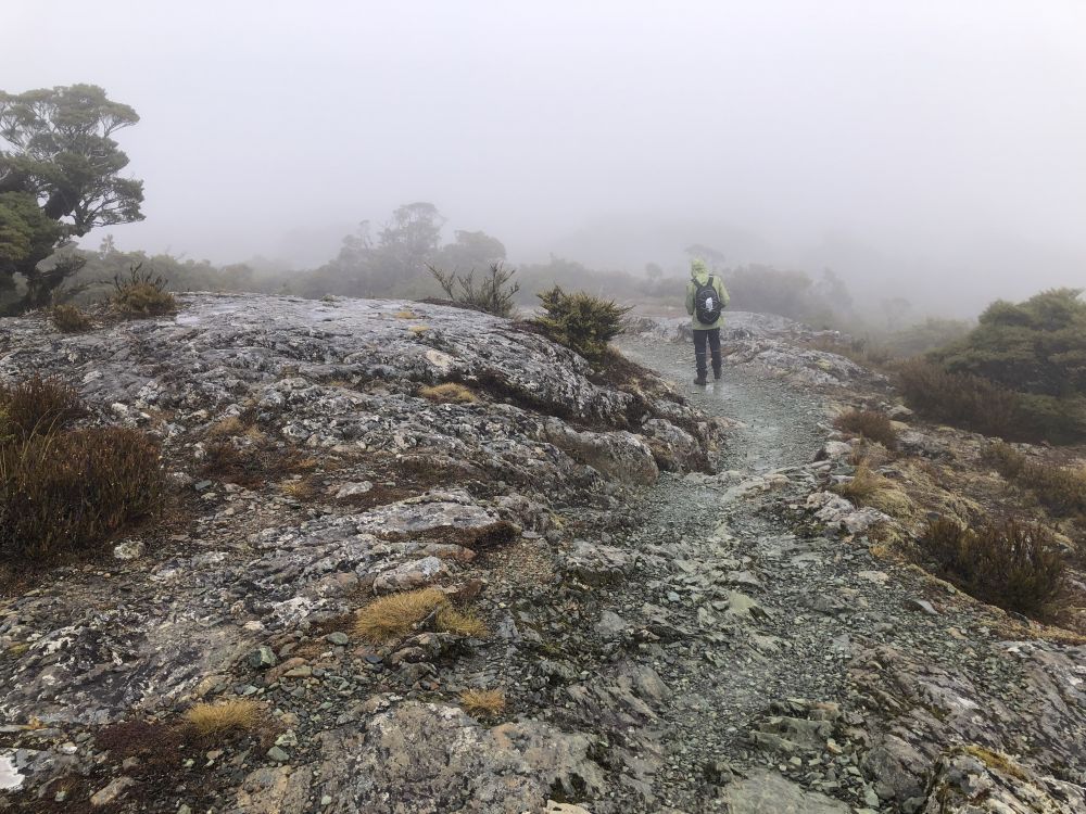 9:50,当他们抵达山顶时,狂风骤起,雨势也稍显增强。山巅早已被浓雾笼罩,远处的 Humbolt 和 Darran 山脉完全隐没在灰白的迷雾中。眼前的景色虽不如晴天壮丽,却多了一种神秘的氛围。