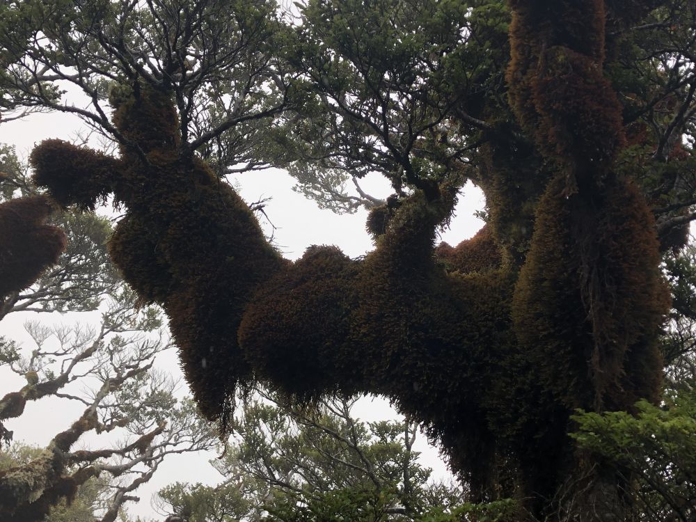 “看那边的小湖!”皮儿指向一片低洼处,一个被雾气笼罩的小湖显露出身影。湖水在迷雾中显得更加幽深,仿佛通向仙境的入口。“虽然看不到远景,想象一下还是可以的。” “再看身边的树”厚厚的苔藓覆盖在树干上,每棵树都像穿了圆鼓鼓的羽绒服。也难怪呀,山顶风大温度低,估计只有这么一武装,才能存活至今吧。多儿不断竖起大拇指????????????边走边感叹??