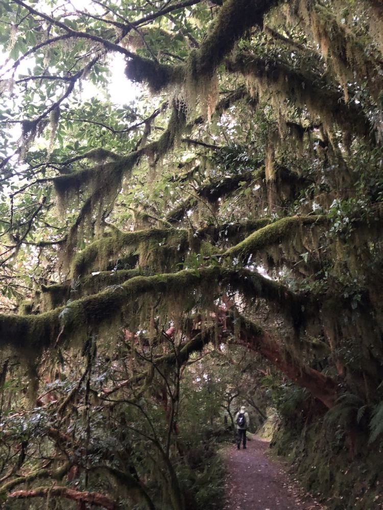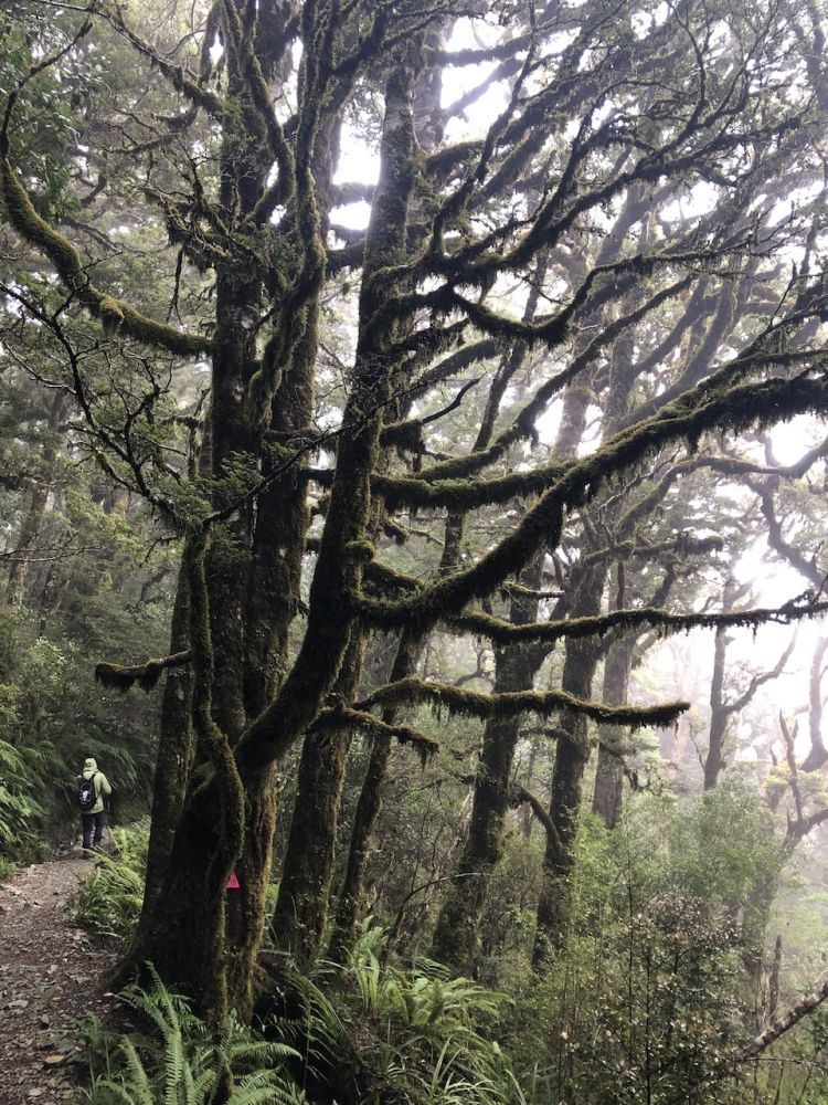 7:50,多儿俩人踏上了第一段步道,穿过银山毛榉组成的雨林隧道。落叶铺满地面,因雨水浸泡,脚步踩上去并不会发出柔和的沙沙声。雨滴从树叶上滑落,偶尔滴在帽檐上。皮儿抬头看着满眼绿色,不禁感叹:“虽然下雨,但这里的森林却显得更加生机勃勃。”