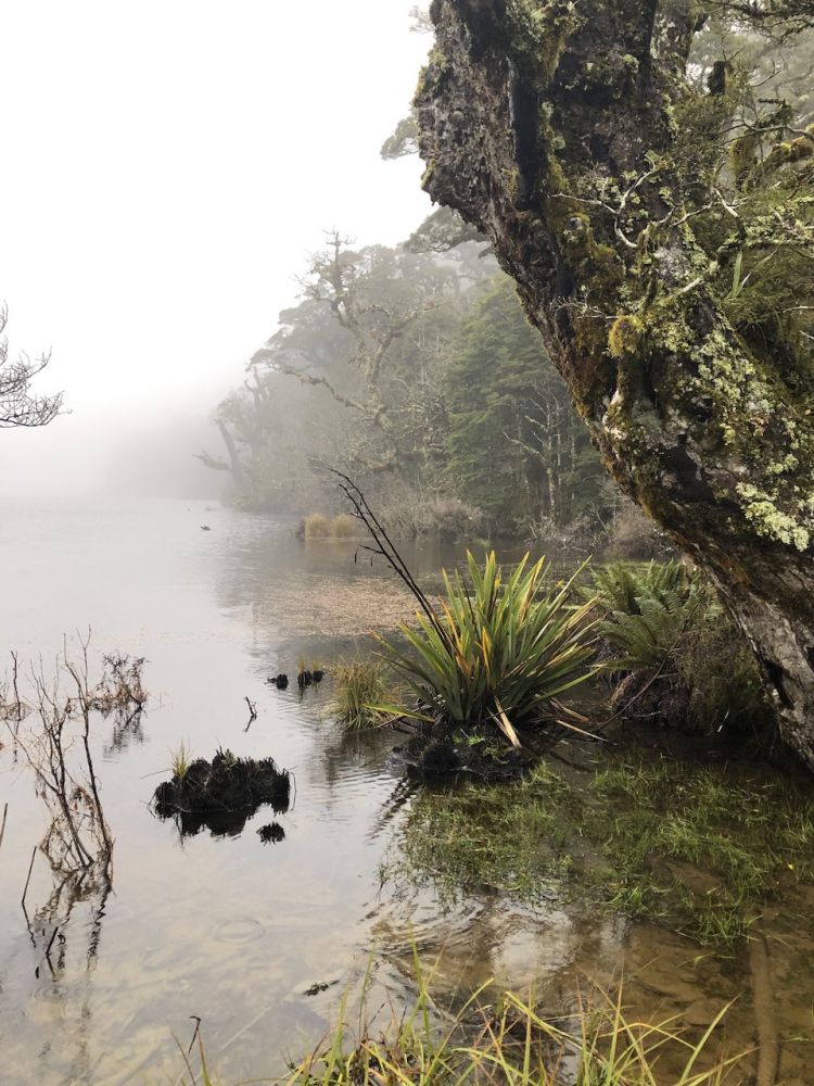 8:50,到达了 豪灯湖(Lake Howden) 湖边。雨雾在湖面上蔓延,给这个宁静的小湖增添了一种超凡脱俗的氛围。“简直像仙境。”多儿惊叹道。湖水被四周的山峦环抱,虽然远方的景色因雾气遮蔽不清,但这份朦胧的美感却令人心醉。