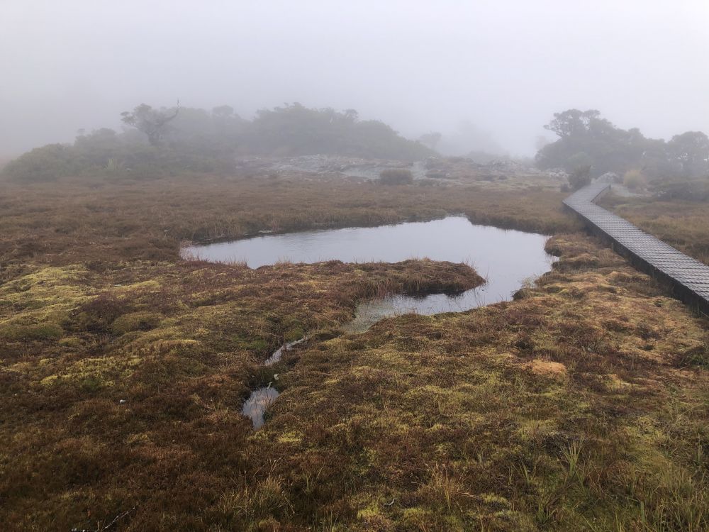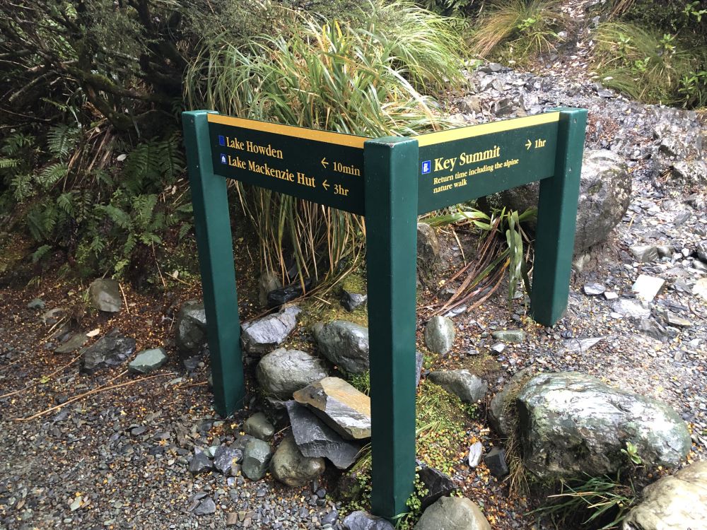 从营地出发时,天色阴沉,细雨轻拍在森林深绿叶片上,空气中弥漫着一股泥土的清香。虽然天气不佳,但皮儿和多儿目标依然明确:穿越 山巅步道(Key Summit Track)、豪灯湖步道(Lake Howden Track) 和 山巅高山自然步道(Summit Peak Alpine Nature Walk),预计大约总长度9.4 公里。