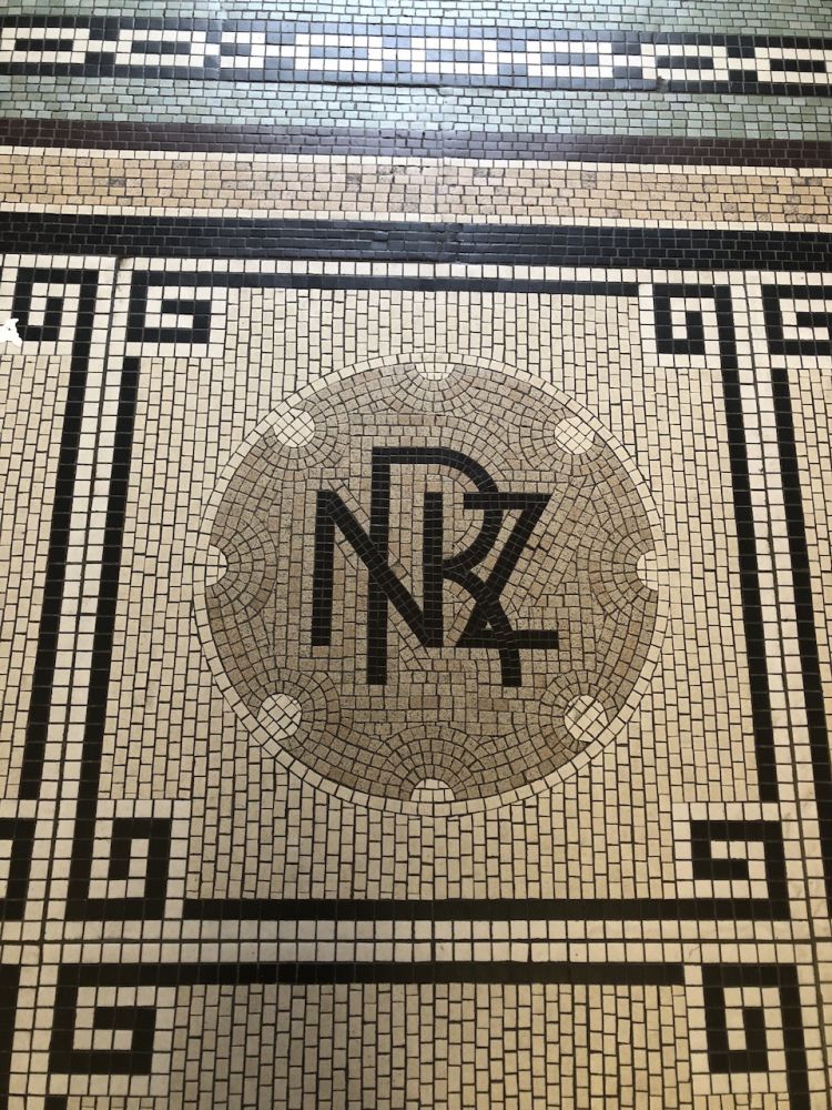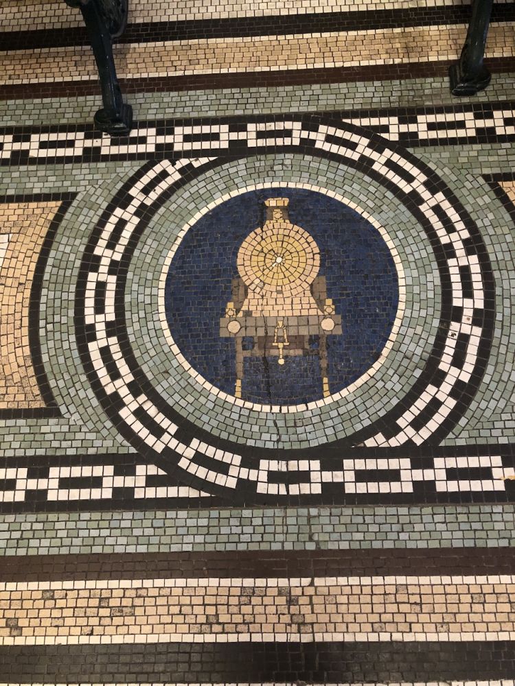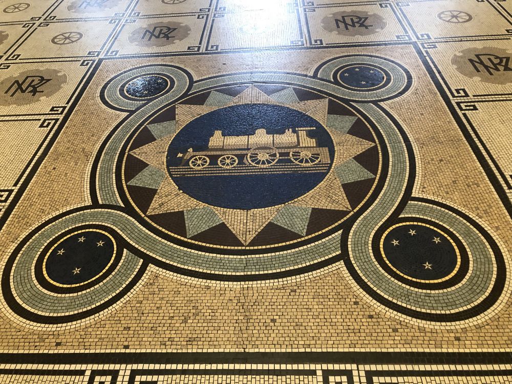 推开厚重的木门,进入售票大厅,眼前顿时一亮——地面上,那幅由近75万块皇家道尔顿瓷砖拼成的马赛克图案熠熠生辉。多儿蹲下来,手指轻轻划过瓷砖表面,仿佛在感受历史的温度。“这里居然还有一幅火车的马赛克画!”她兴奋地指向地板中央。皮儿顺着她的手指望去,又抬头看向彩色玻璃窗,那些描绘着火车元素的图案,让整个空间都流露出一股浓厚的铁路文化气息。