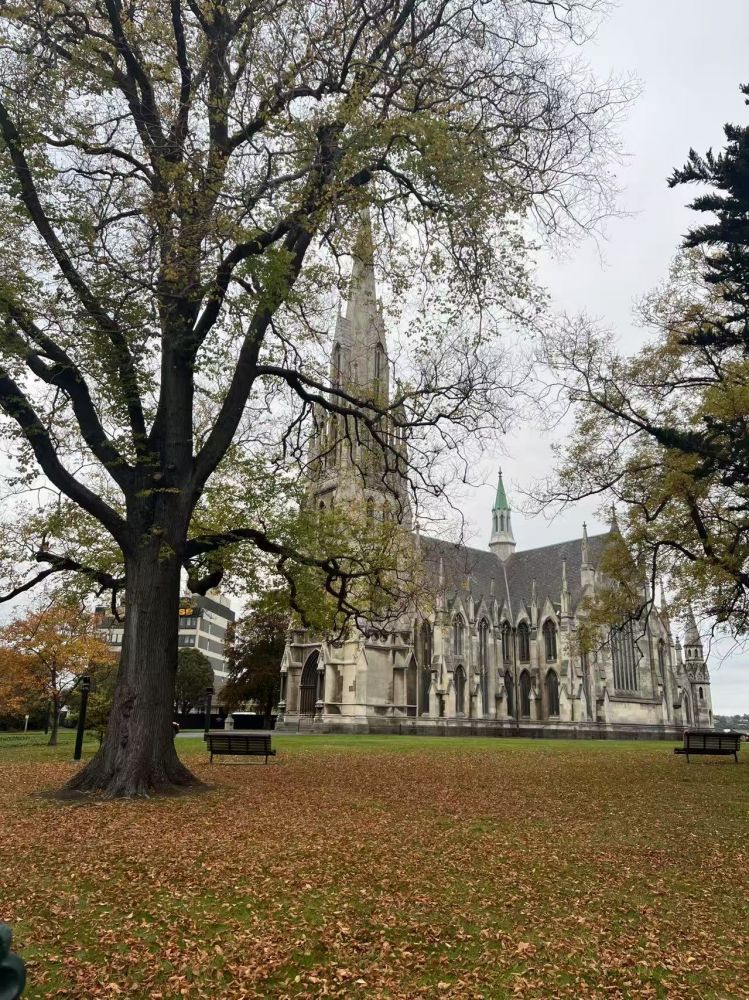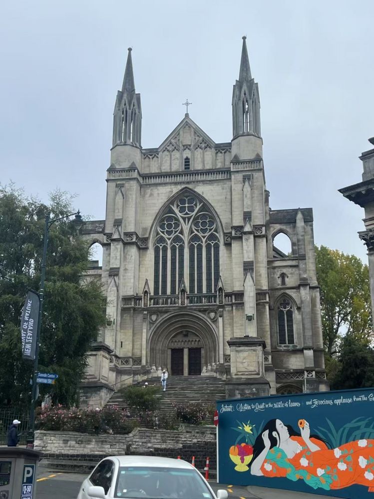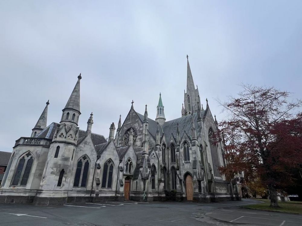 从火车站出来,俩人沿着斯图亚特街(Stuart Street)缓步前行,不远处便是圣保罗大教堂(St. Paul’s Cathedral)。洁白的石墙在阳光下泛着柔和的光泽,尖顶直指蓝天。想象中推门而入,殿堂内寂静无声,唯有阳光透过彩色玻璃洒落在木质长椅上,投下斑驳的光影。估计总是有人站在管风琴前,驻足静听悠扬琴音在教堂里回荡。