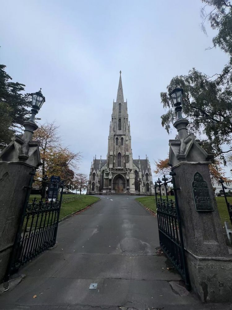 离开圣保罗大教堂,又来到第一教堂(First Church of Otago)。这座由灰色石块砌成的哥特式建筑,是但尼丁最古老的教堂之一。高耸的尖塔直冲云霄,给人一种庄严肃穆的感觉。继续幻想推开厚重木门,里面一排排整齐木椅,人们仍象百年前一样在这里低声祈祷。“这座教堂的设计师是罗伯特·劳森(Robert Lawson),他还是拉纳克城堡的建筑师呢。”皮儿轻声说道。