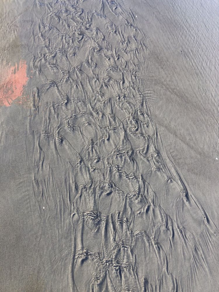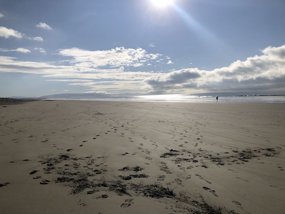 四月的海水已带着丝丝寒意,不适合游泳。海滩上少有人活动——有三三两两的冲浪爱好者在海浪前观望,等待最佳练习时机。整个早晨,还见到一位女士在遛她的两只狗。狗儿欢快奔跑的样子,与主人深沉坚定的步伐形成鲜明对比。成了海滩一道靓丽的风景。