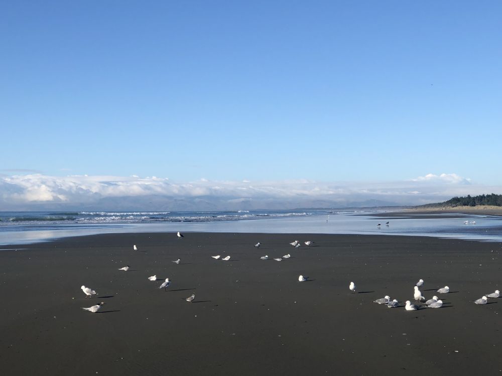 露营车驶入崴库库海滩停车场时,晨曦已将天边染得透亮。一片金黄色的沙滩无尽延展,海风轻轻吹拂,掀起浅蓝色的海浪,在远处层层叠叠地拍向岸边。几只海鸥悠闲地踱步,偶尔侧着头,似乎对新来的访客产生了一丝兴趣。