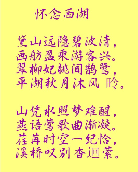豁然西湖上 闌珊秋意涼 夢裏時尋訪 別來可無恙