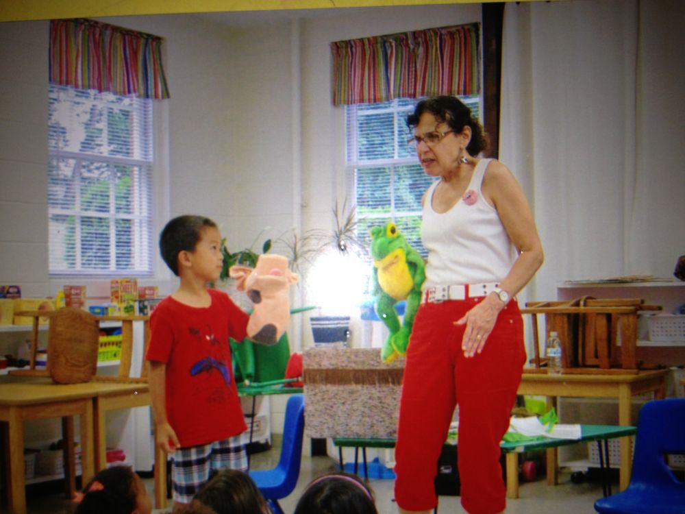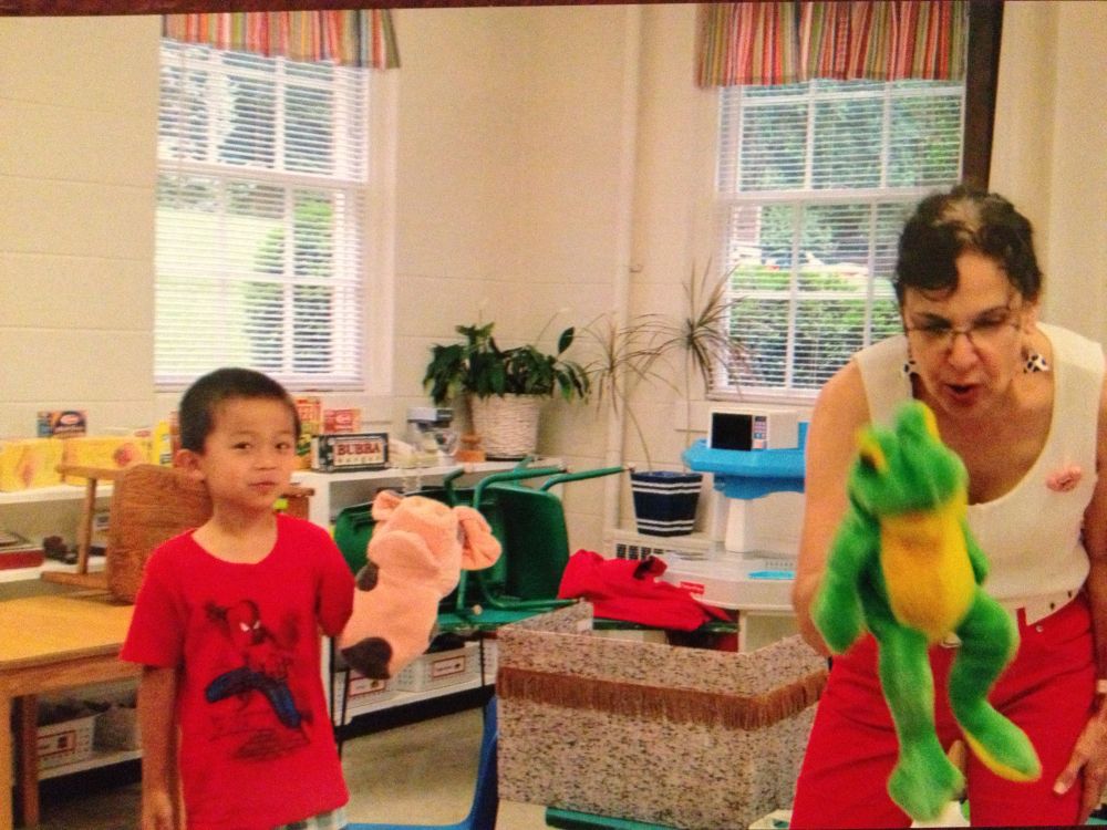 哥哥小朋友在学校给来讲故事的奶奶做助手装饰