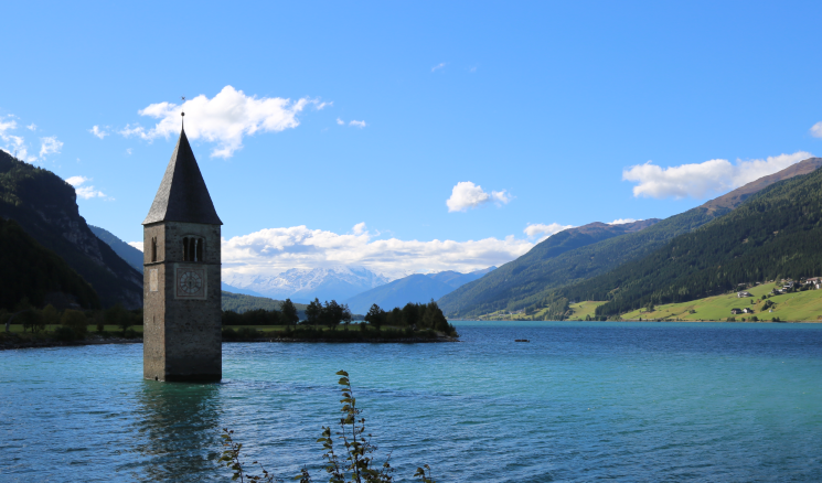 水中教堂早餐后,弗丽太太站在大门边,目视着我把行包挂上自行车。她身材瘦小,脸上表情不多,但不知为何,我内心一动,竟然唤起我久远的、在村头和父母告别的记忆!我冲她挥挥手,踏车继续我的旅程。太阳升起来了,山村安宁静谧,路边湖光旖旎。今天是下坡路,我的目标是百公里外的巴尔扎诺。出村口时,我注意到牌子上写着Reschen/Resia,一村两名,肯定是语言&ldq[