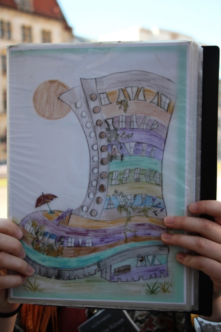 两德统一后的90年代初,城市考虑拆除这个建筑,拆除后,重建成什么样,众说纷纭。规划人员,别出心裁,以此为题材,搞了一个儿童绘画比赛,上图,即是当时的获奖作品。