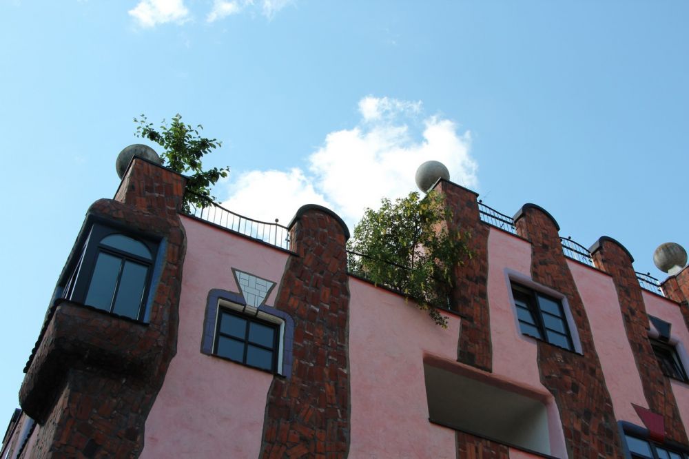 8. 有的树植入了外墙里。按照百水的建筑哲学,租户有义务尽他的”养护“义务。建成后,外墙就不应该再做人工干预。植物的生长,和风吹日晒,会让房子变老,让人感到建筑物也是有生命的。