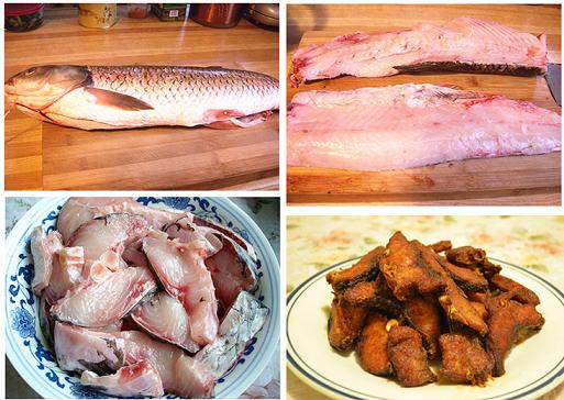 自己成家以后也用不同种的鱼做过熏鱼,如白鱼(WHITE FISH)-西人店里有卖的、带鱼,味道都很不错。我个人觉得熏鱼做的好关键有两点:一是鱼要高温油炸两次;第二就是浸鱼的汁一定要调得到位。油炸的时候一定要选一个深一些的锅,不要烫伤自己;浸鱼汁调好后在炉火上烧开并保持沸腾,便于经过有炸的鱼片吸收汤汁。昨天买了一条草鱼,又做了爱吃的熏鱼,为年夜饭做准备。