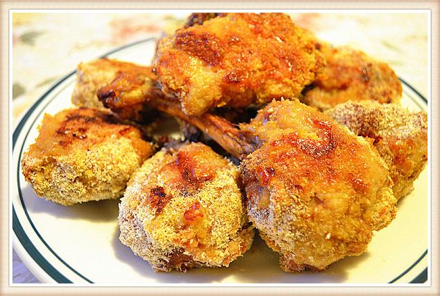 4 把沾好面包粉的鸡锤放入烤盘中,390F 烤35 分钟,中途翻一次面。