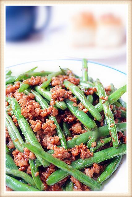 材料:四季豆250克,猪肉碎25克,大蒜4瓣,耗油2大匙,酱油1小匙,色拉油 250克(用于过油)。