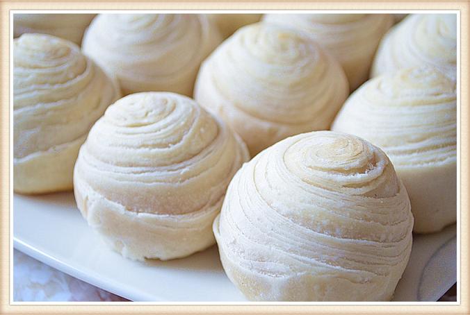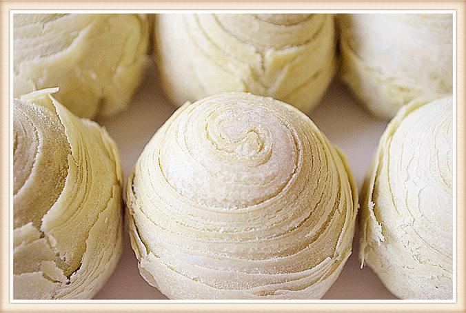 1 混合油皮的所有材料揉成光滑的水油皮面团,静置30分钟;