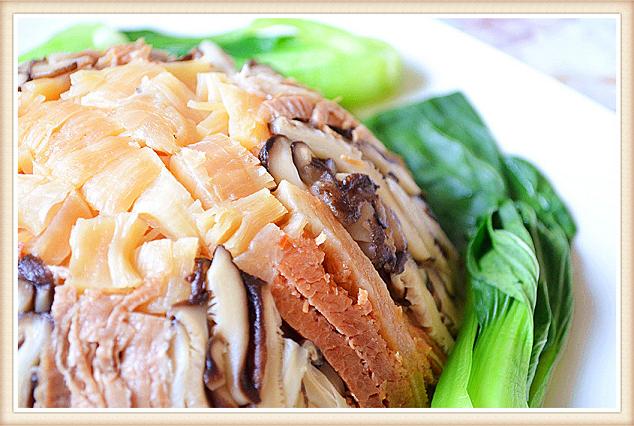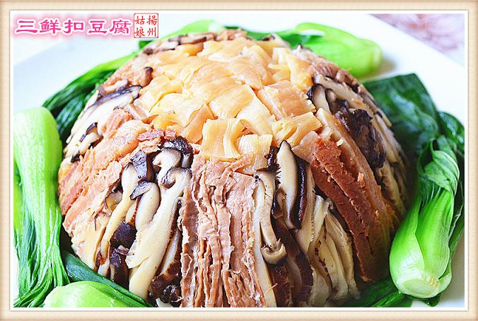 三鲜扣豆腐是一款比较清淡的碗头菜,味道鲜美,不油腻,多吃两口又没有增肥的担心。这个菜的最大特点就是你可以事先准备好,在朋友聚会或节日家宴的时候,你不用花很多的时间在厨房里而耽误和朋友聊天的机会。需要吃的时候只要回锅蒸制一下,倒扣出盘,出菜漂亮,风味一点都不打折扣。因为豆腐本身没有味道,所以在制作这道菜时就选用了干贝、火腿和香菇等食材来让它味道十足,这样在蒸制的过程中,豆腐可以很好的吸收到这些食材的鲜味而有滋有味。曾经在一个台湾的美食节目中看到程安琪老师做这道菜,非常喜欢。周末有时间在家实习了一下,味道很赞。做一道功夫菜会让你很有成就感,如果喜欢的话不妨也试一试。