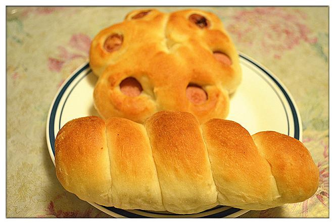 多余的面团做了两个小面包热狗卷和花形热狗。