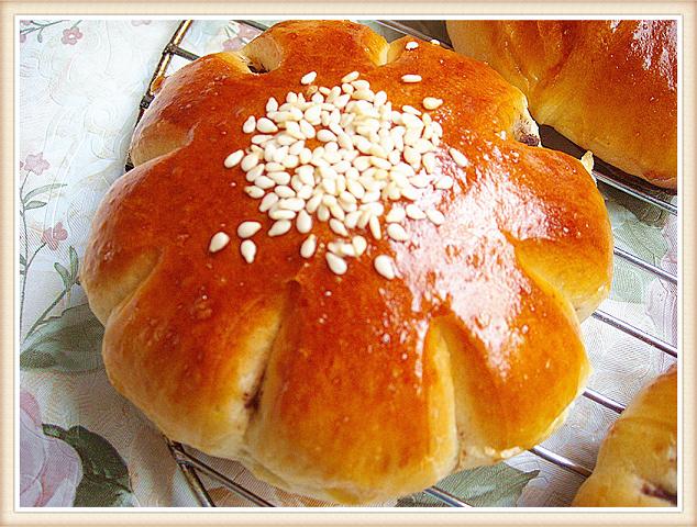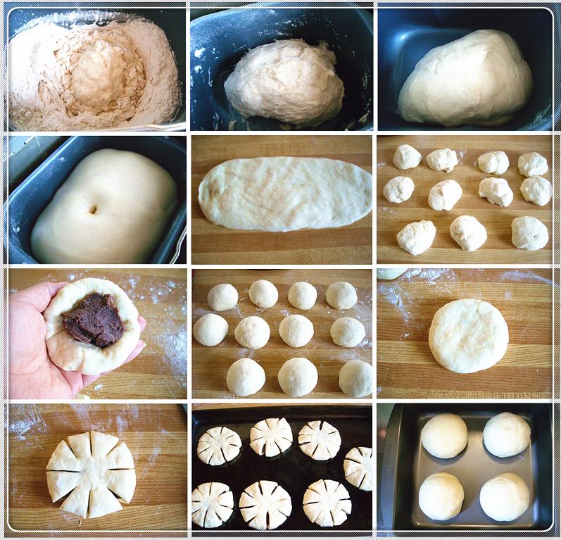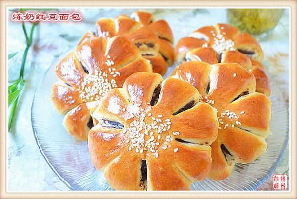 做面包我喜欢随性,掌握好做面包的基本成分配比,喜欢加什么材料就可以随意发挥了。有时看一些烹调书,就比较喜欢作者标明成分时用杯(CUP)、大匙(TBSP)、小匙(TSP),这样读者看完书后想自己操作就比较方便,便于读者跟着学。比较不喜欢菜谱里用克来作计量,想象一下做菜的时候还要拿一个秤在旁边,再有兴趣也就被慢慢地被消磨掉了。前一阵看了一本『孟老师的100个面包』的食谱,就同样遇到了这个问题,里面的面包造型我非常喜欢,就是所有的成分都是以克计量的不太喜欢。不过有了做面包的基础,再加上孟老师的一些好的主意,做出好面包也不难。在书里看到一款红豆面包非常喜欢,今天正好有时间,就用自己的成分配比加上孟老师的创意设计,一道炼奶红豆面包就出炉了。做面包我喜欢用三杯面粉、1.5-2.0 小匙的酵母。甜面包加糖6小匙、盐1/2小匙;咸面包糖1.5小匙、盐的量看加的咸味材料而定。因为家里没有奶粉,也不想为了做面包而买一罐奶粉在家,所以在做甜面包时喜欢加炼奶,奶香浓郁,非常喜欢。因为儿子在吃很多甜食时都喜欢加炼奶,所以炼奶这个材料家里常备,把炼奶加到面包里儿子还是比较喜欢的。