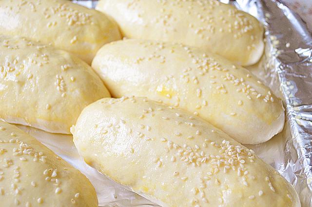 10 发好的面团取出,刷上蛋液,撒上白芝麻,放入预热到360F 的烤箱中层烤15分钟。