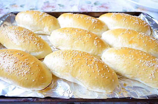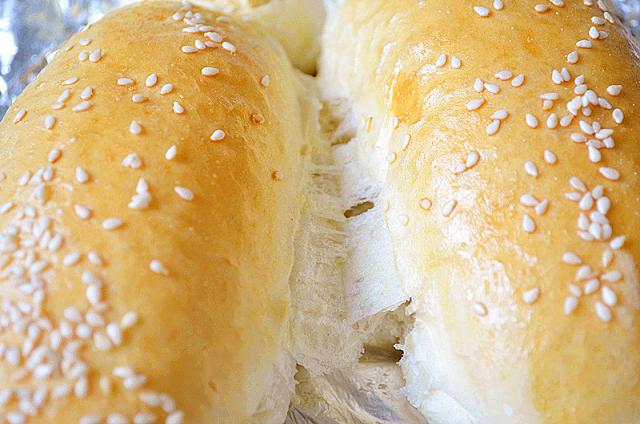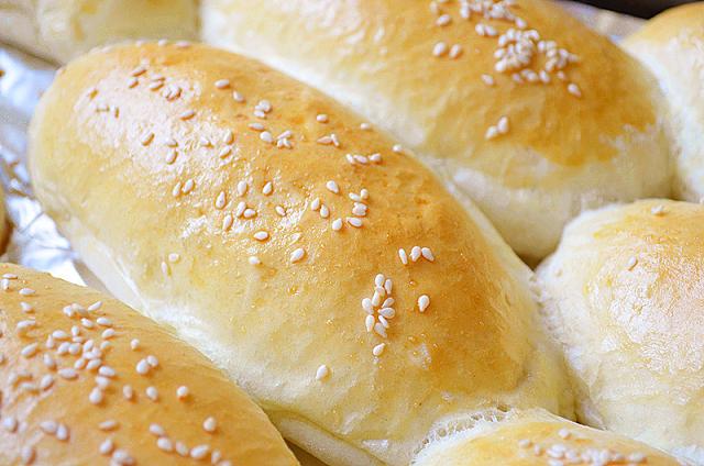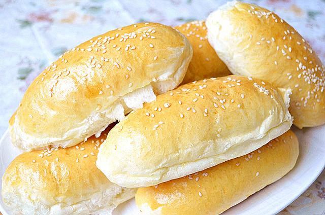 11 烤好的面包取出放凉,可以从侧面切一刀也可以从中间切一刀来放香肠;
