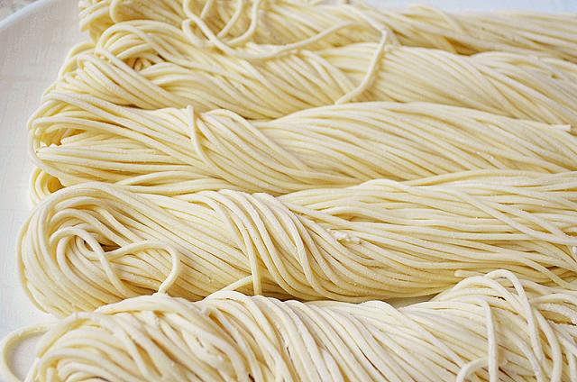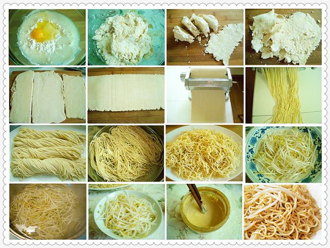 3 把光滑的面片继续压薄,然后压成细的面条;(压出了的面条呈淡黄色是因为加了鸡蛋)