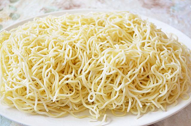 4 据说上海冷面的制作是先蒸后下,我干脆就上锅蒸了20分钟左右,中途在面条上撒了两次水以防太干;(这样蒸出来的面条每一根都很饱满,筋道)