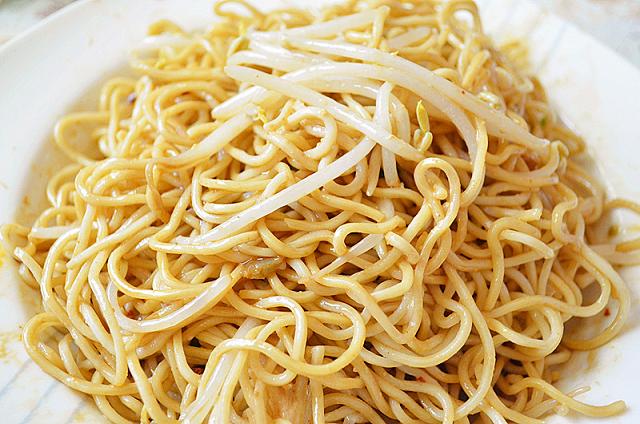 8 最后,取一个碗放入冷面和烫熟的绿豆芽,接着加生抽、醋和麻油,然后放入多多的花生酱。一般来说,生抽可以少放一些防止太咸,醋可以稍多放一些,拌和一下就可以吃了。喜欢吃辣的还可以放入少许辣油,LG 还切了一些榨菜丁在里面,说可以增加口感。
