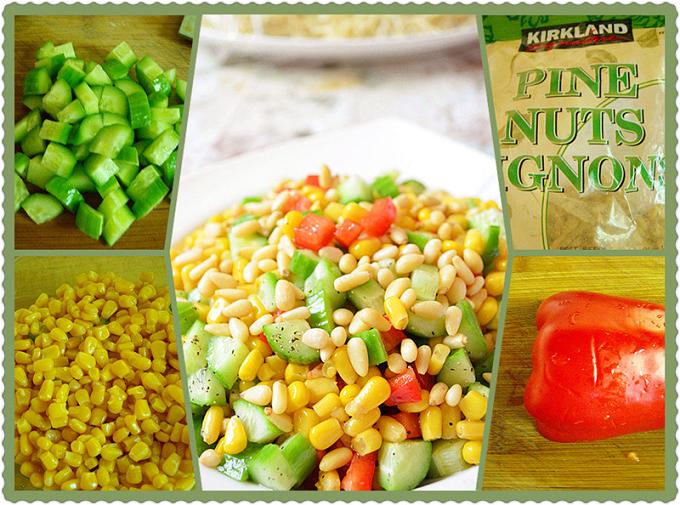 把红椒和黄瓜切成丁,加入甜玉米粒,放入少许盐、黑胡椒粉和橄榄油拌和,最后撒上熟松子仁,吃的时候把它们拌在一起,简单美味的一盘凉拌菜就上桌了。