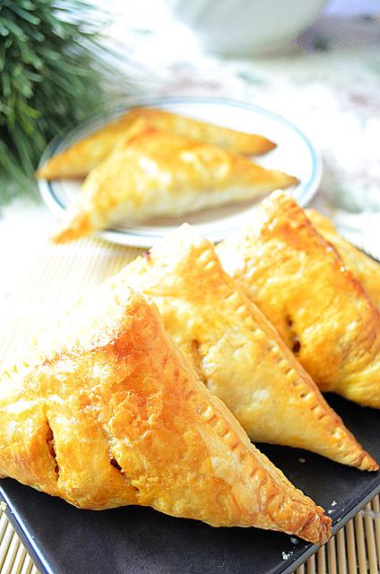 6 取一片酥皮,放上冷却的馅料,在酥皮的两边刷上蛋液,然后把正方形的酥皮对角对折,轻轻按压边缘使粘合;