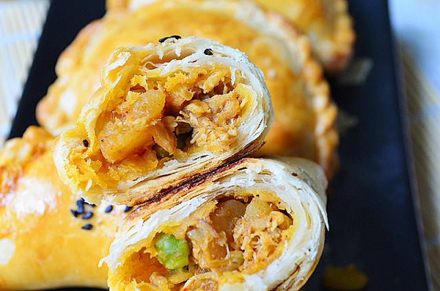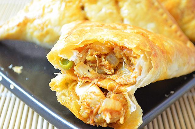 LG买了一只烤鸡还剩一半没有吃完,大家都不想再吃了,尤其是鸡胸部分,觉得太干。查看了一下冰箱,发现还有一盒酥皮在冰箱里没有用,这是防止自己想偷懒不想自己做酥皮的时候用的。于是有了主意,开始着手做东南亚比较流行的小吃-咖喱角。为什么说是简易的呢?当然就是省去了做酥皮的这一步了。做出来的咖喱角很受欢迎,不仅使吃不完的鸡肉有了用武之地,同时还尝到了一款风味小吃,一举两得。