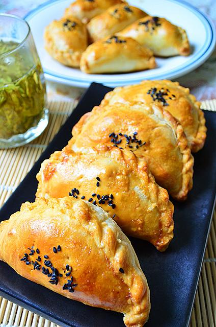 8 在做好的咖喱角上刷上全蛋液,放入预热到420F的烤箱中烤15分钟。