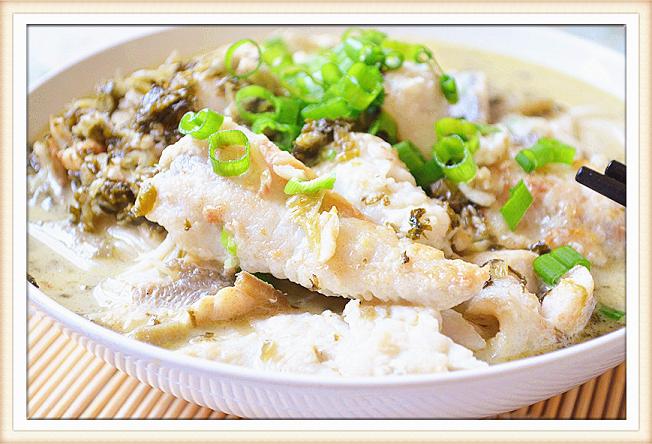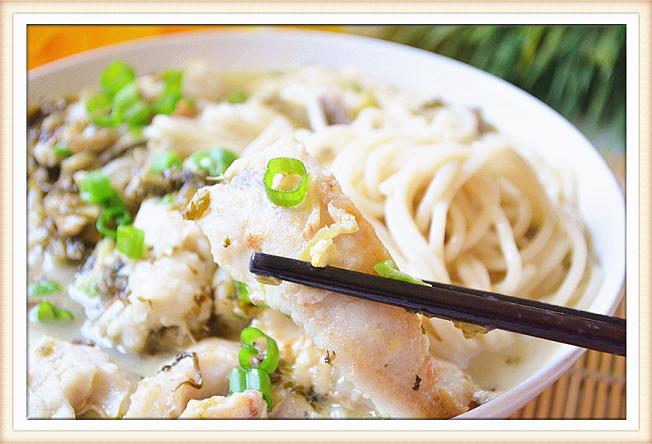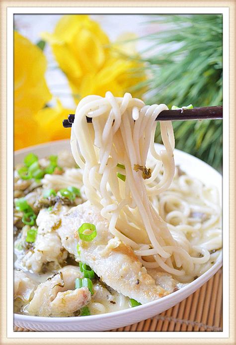 12 刚烧好的雪菜鱼汤直接浇在面条上,撒上葱花,放入少许白胡椒粉就可以开吃了。