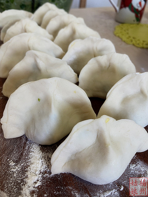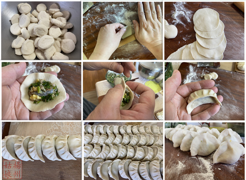 从盆中拿出几个剂子,用擀面杖擀成中间厚四周薄的圆形饺子皮。接着,你就可以把饺子包成各种你喜欢的形状。我们扬州地区饺子的包法都是这种花边形的,北方地区的大肚饺今天第一次尝试,包的不太好看。不管什么形状的,只要好吃就行。