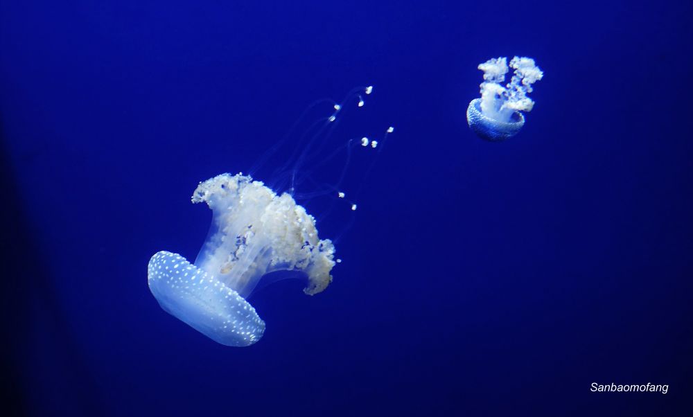 水母(Jellyfish)是一种漂亮的水生动物。它的身体外形就像一把透明伞。有些水母不单颜色多变,而且还会在水中发光,有些闪耀著微弱的淡绿色或蓝紫色光芒,有的伞状体还带有各色花纹。在水族馆里,这些游动着的色彩各异的水母变成光彩夺目的彩球,光影随波摇曳,非常优美。