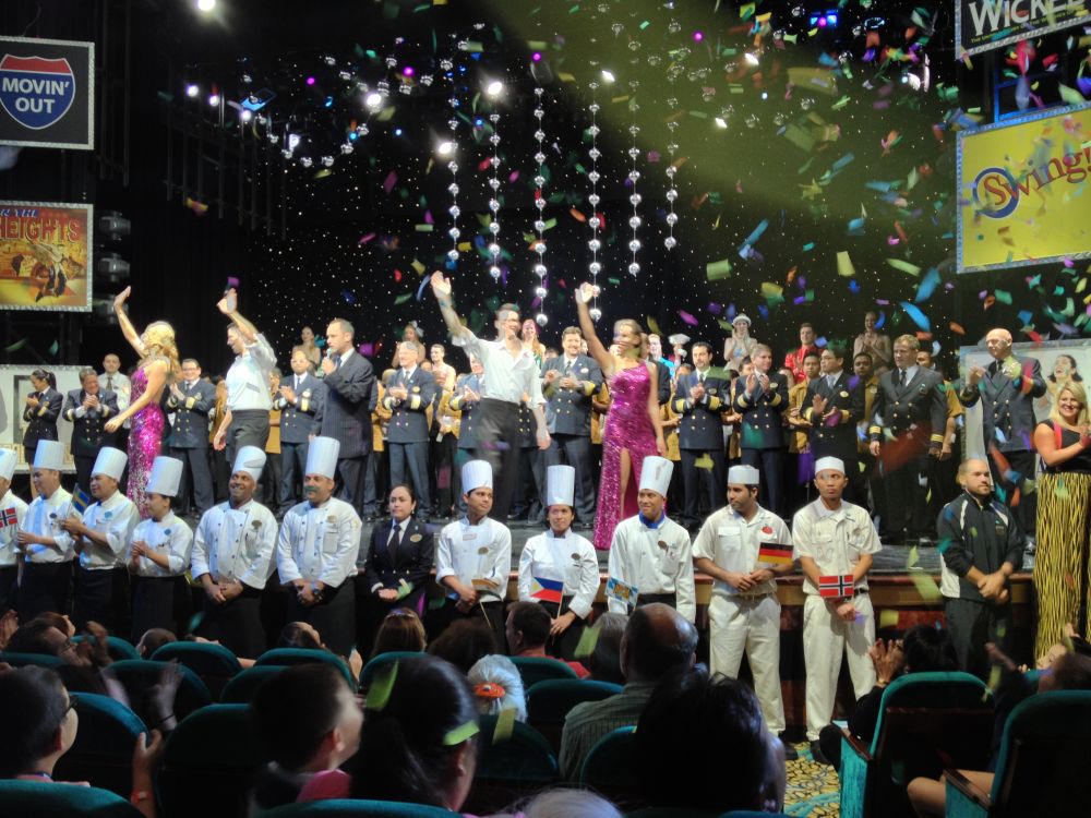 晚上一台精彩的百老汇演出之后,主持人问大家是否愿意回家,众口一个No字,然后,船长带着工作人员都上了台,做饭的,清洁房间的,端盘子的,一个个熟悉而又亲切的笑容,突然,俺产生了一种难舍之情。