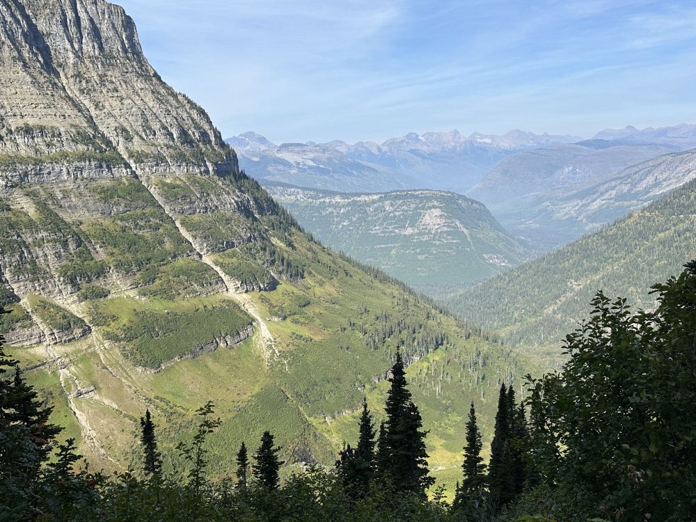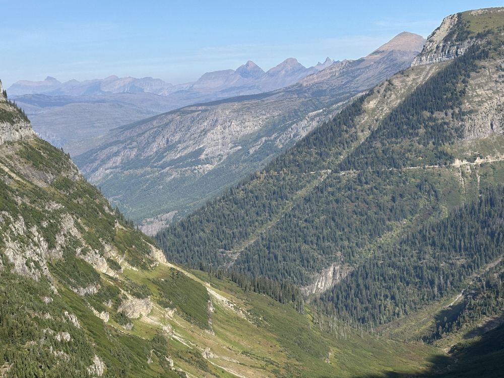 胡班长因为脚不舒服,和我商量过她提前折返,我自己继续走到既定目标然后返回,我们停车场不见不散。但这种路况迅速打消了我的独自前行的勇气,这样徒步没有享受,时刻提心掉胆,还要时不时和对方的徒步者互相礼让,有时要格外小心。走不快就不说了,心里承受的压力让我无法享受周围的景色,那这样走下去还有什么意义呢?于是在走了不到两迈的地方我们决定掉头,没有了前面的不确定性,心情顿时放松。回到Logan Pass再次休息补充能量以后,我们沿着公路回到我们的停车位。